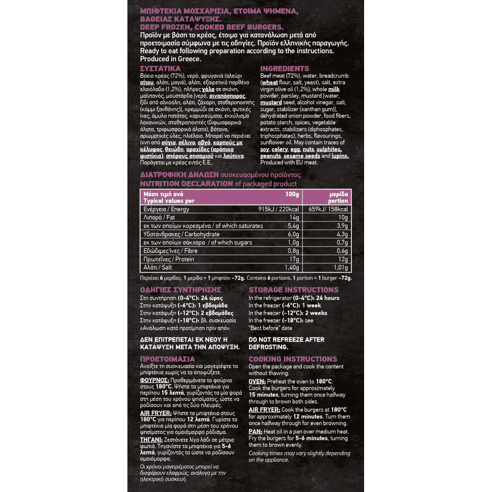 Βόειο κρέας (72%), νερό, φρυγανιά (αλεύρι σίτου, αλάτι, μαγιά), αλάτι, εξαιρετικό