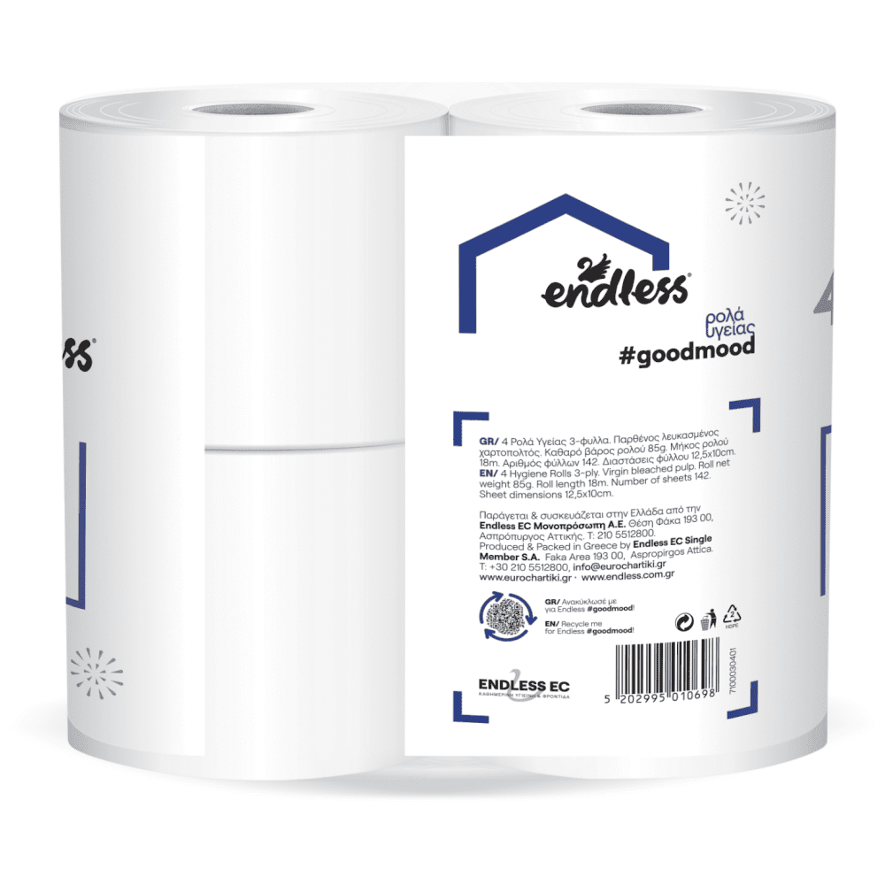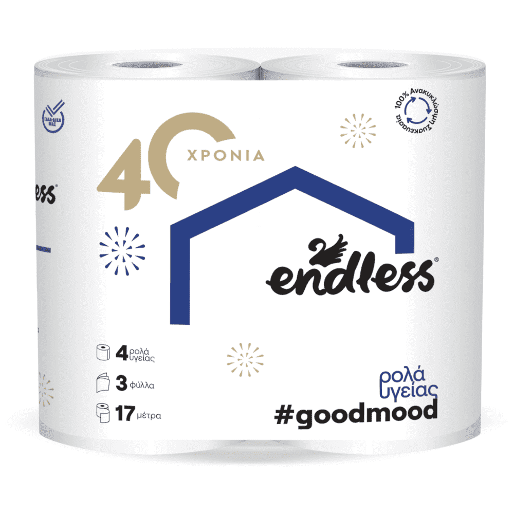 Η Endless γιορτάζει τα 40 χρόνια ιστορίας της με τον επετειακό κωδικό 4 ρολών υγείας που χαρίζουν αποτελεσματική απορροφητικότητα και άνετη χρήση, σε ανθεκτική συσκευασία που τα προστατεύει από τη σκόνη και την υγρασία. Ελαφρώς γκοφραρισμένα με ανάγλυφο σχέδιο, για υπέροχη αίσθηση.