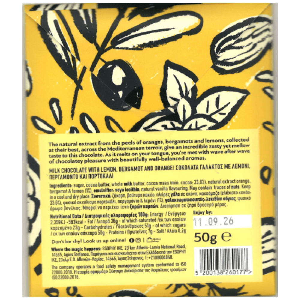 Σοκολάτα γάλακτος με εκχυλίσματα πορτοκαλιού, περγαμόντου και λεμονιού είναι ο απόλυτος συνδυασμός φρεσκάδας και γλυκύτητας. Η φυσική γεύση των φρούτων, που συλλέγονται στην πιο ιδανική στιγμή τους από διαφορετικές περιοχές της Μεσογείου, προσφέρει μια ζωντανή και αναζωογονητική εμπειρία γεύσης. Καθώς η σοκολάτα λιώνει στον ουρανίσκο, τα εκχυλίσματα πορτοκαλιού, περγαμόντου και λεμονιού συνδυάζονται με την πλούσια, κρεμώδη υφή της σοκολάτας, προσφέροντας μία απόλαυση που συνδυάζει την ένταση των εσπεριδοειδών με την ισχυρή γλυκύτητα της σοκολάτας. Η σοκολάτα αυτή είναι ιδανική για συνδυασμούς με ένα γλυκό λευκό αφρώδες κρασί ή ένα κρασί Madeira, δημιουργώντας έναν ιδανικό γευστικό συνδυασμό για τις πιο απαιτητικές γευστικές προτιμήσεις.