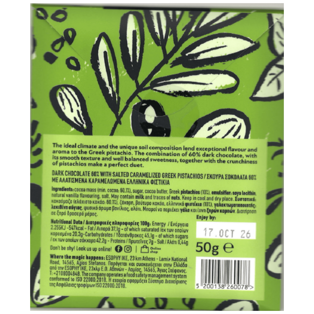 Σοκολάτα 60.1% κακάο με φιστίκια Αιγίνης, συνδυάζει την πλούσια γεύση της σοκολάτας με την τραγανή υφή των φιστικιών για μια μοναδική γευστική εμπειρία.