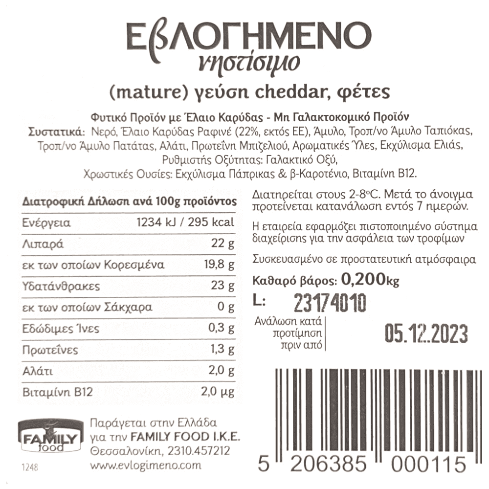 Το ΕβΛΟΓΗΜΕΝΟ νηστίσιμο γεύση cheddar απαντά στις ανάγκες όσων, για λόγους υγείας ή στάσης ζωής, έχουν αποκλείσει τα γαλακτοκομικά από τη διατροφή τους. Ξεχωρίζει για τα διατροφικά του στοιχεία (φυτική πρωτεΐνη, Β12, φυσικό εκχύλισμα ελιάς) καθώς και για τη νοστιμιά του. Με γεμάτη και ώριμη γεύση, πλούσια, κρεμώδη υφή και αυθεντικό άρωμα αρχοντιάς συμπληρώνει κάθε γεύμα ή καταναλώνεται και μόνο του σαν σνακ. Είναι ιδανικό για τη διατροφή vegan και όσων παρουσιάζουν ευαισθησία ή δυσανεξία στη λακτόζη, στις πρωτεΐνες γάλακτος και στη γλουτένη. Κατάλληλο για να αποτελέσει μέρος ενός ισορροπημένου διαιτολογίου, που ακολουθεί τους κανόνες της μεσογειακής διατροφής.