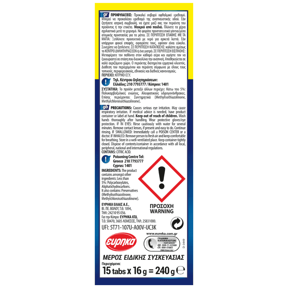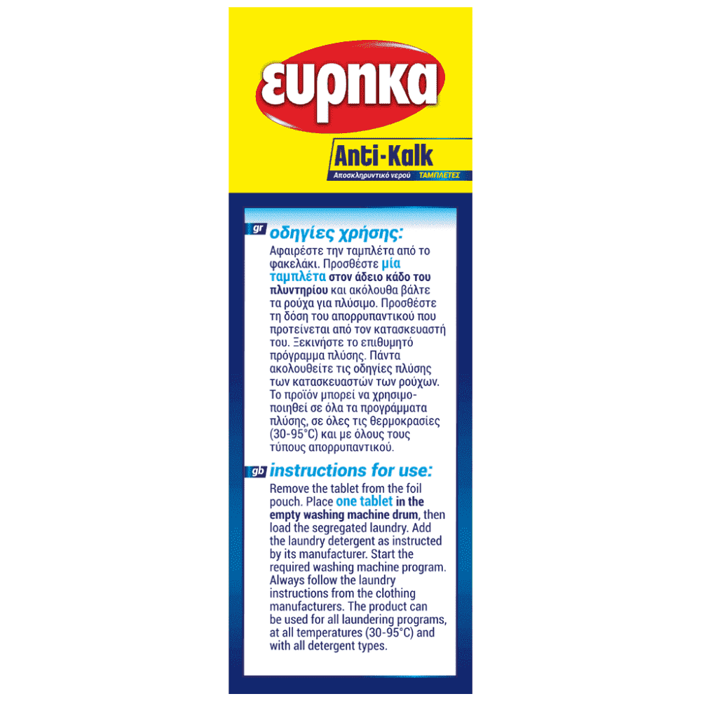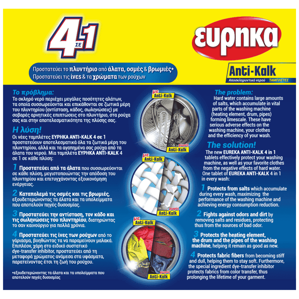 Μία ταμπλέτα Eύρηκα Anti-Kalk 4 σε 1 σε κάθε πλύση, καταπολεμά τις οσμές και τις βρωμιές, απομακρύνοντας τα άλατα και τα υπολείμματα που αποτελούν πηγές δυσοσμίας, ενώ προστατεύει την αντίσταση, τον κάδο και τις σωληνώσεις του πλυντηρίου, διατηρώντας το σαν καινούργιο! Με τον τρόπο αυτό μεγιστοποιείται η απόδοση του πλυντηρίου με αποτέλεσμα να εξοικονομείται ενέργεια. Παράλληλα, οι νέες ταμπλέτες Εύρηκα Anti-Kalk 4 σε 1 προστατεύουν τις ίνες των ρούχων από το γάριασμα, ενώ χάρη στο ειδικό συστατικό dye-transfer inhibitor, εμποδίζουν τη μεταφορά χρώματος ανάμεσα στα υφάσματα, παρατείνοντας έτσι τη ζωή του ρούχου!