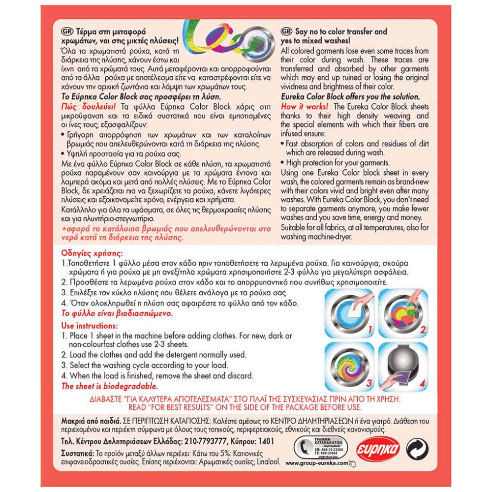 Τοποθετήστε 1 φύλλο μέσα στον κάδο πριν τοποθετήσετε τα λερωμένα ρούχα. Για καινούργια, σκούρα χρώματα ή για ρούχα με μη ανεξίτηλα χρώματα χρησιμοποιήστε 2-3 φύλλα για μεγαλύτερη ασφάλεια. Προσθέστε τα λερωμένα ρούχα στον κάδο και το απορρυπαντικό που συνήθως χρησιμοποιείτε. Επιλέξτε τον κύκλο πλύσης που θέλετε ανάλογα με τα ρούχα σας. Όταν ολοκληρωθεί η πλύση σας αφαιρέστε το φύλλο από τον κάδο. Το φύλλο είναι βιοδιασπώμενο. Για καλύτερα αποτελέσματα: Ακολουθείτε πάντα τις οδηγίες πλύσης στις ετικέτες των ρούχων. Πλένετε τα καινούργια χρωματιστά ρούχα μόνα τους στις πρώτες 5-6 πλύσεις. Μην πλένετε σκούρα ρούχα που ξεβάφουν μαζί με ανοιχτόχρωμα χρωματιστά ή λευκά ρούχα. Αν πλύνετε ρούχα που ξέρετε ότι ξεβάφουν πολύ, είναι καλύτερο να χρησιμοποιήσετε 2 φύλλα στην πλύση. Ξεχωρίστε και απλώστε τα ρούχα να στεγνώσουν, αμέσως μετά το τέλος της πλύσης. Χρησιμοποιήστε το φύλλο του Εύρηκα Color Block μόνο για μία φορά.