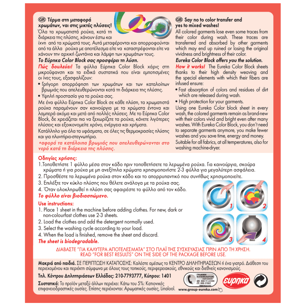 Τοποθετήστε 1 φύλλο μέσα στον κάδο πριν τοποθετήσετε τα λερωμένα ρούχα. Για καινούργια, σκούρα χρώματα ή για ρούχα με μη ανεξίτηλα χρώματα χρησιμοποιήστε 2-3 φύλλα για μεγαλύτερη ασφάλεια. Προσθέστε τα λερωμένα ρούχα στον κάδο και το απορρυπαντικό που συνήθως χρησιμοποιείτε. Επιλέξτε τον κύκλο πλύσης που θέλετε ανάλογα με τα ρούχα σας. Όταν ολοκληρωθεί η πλύση σας αφαιρέστε το φύλλο από τον κάδο. Το φύλλο είναι βιοδιασπώμενο. Για καλύτερα αποτελέσματα: Ακολουθείτε πάντα τις οδηγίες πλύσης στις ετικέτες των ρούχων. Πλένετε τα καινούργια χρωματιστά ρούχα μόνα τους στις πρώτες 5-6 πλύσεις. Μην πλένετε σκούρα ρούχα που ξεβάφουν μαζί με ανοιχτόχρωμα χρωματιστά ή λευκά ρούχα. Αν πλύνετε ρούχα που ξέρετε ότι ξεβάφουν πολύ, είναι καλύτερο να χρησιμοποιήσετε 2 φύλλα στην πλύση. Ξεχωρίστε και απλώστε τα ρούχα να στεγνώσουν, αμέσως μετά το τέλος της πλύσης. Χρησιμοποιήστε το φύλλο του Εύρηκα Color Block μόνο για μία φορά.