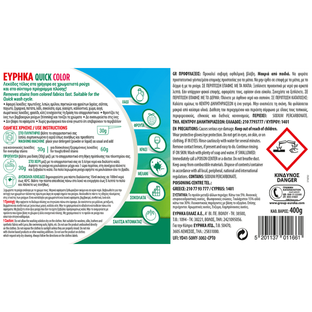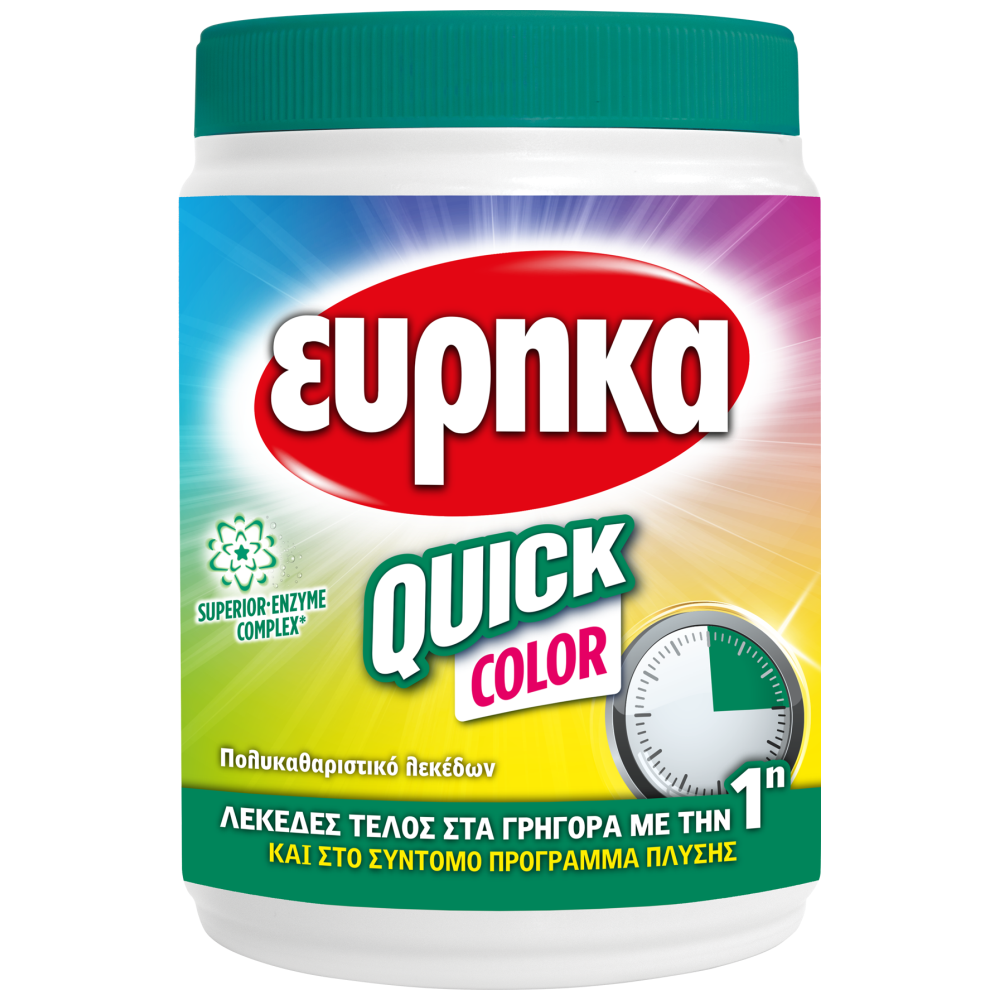 Το νέο ΕΥΡΗΚΑ Quick Color είναι ειδικά σχεδιασμένο για να εξαφανίζει τους λεκέδες γρήγορα με την 1η. Με εξελιγμένη σύνθεση που το κάνει ιδανικό για το σύντομο πρόγραμμα πλύσης. Το ολοκληρωμένο σύστημα ενζύμων που διαθέτει δρα από τους 30°C, αφαιρώντας λεκέδες από κρέας, σάλτσα, παγωτό, ζυμαρικά, πατάτα, λάδι, σοκολάτα, αίμα, γιαούρτι, καλλυντικά, χώμα, αυγά, σωματικούς λεκέδες, κλπ. ενισχύοντας τη δράση του απορρυπαντικού. Εκτός από την καθαριστική του δράση, τονίζει τα χρώματα και φροντίζει τις ίνες των βαμβακερών ρούχων.