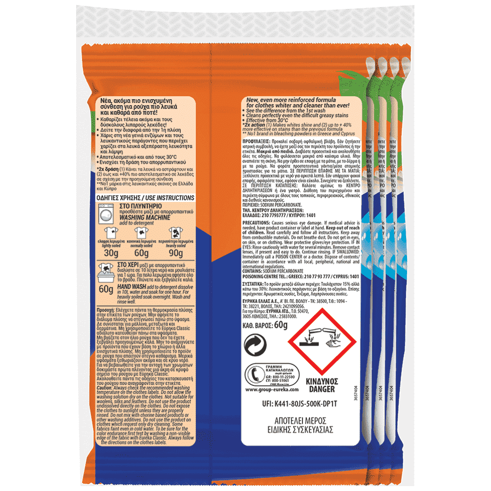 "Υπερλευκαντικό σε σκόνη. Τα λευκά ξαναζωντανεύουν από την 1η πλύση! ΕΥΡΗΚΑ Classic με άρωμα άνθη πορτοκαλιάς με νέα πιο ενισχυμένη σύνθεση για ρούχα πιο λευκά και καθαρά από ποτέ. Το Νέο ΕΥΡΗΚΑ Classic Άνθη πορτοκαλιάς, χάρις στη νέα γενιά ενζύμων και τους λευκαντικούς παράγοντες που περιέχει, απομακρύνει τέλεια, ακόμα και τους δύσκολους λιπαρούς λεκέδες, και χαρίζει στα ρούχα αξεπέραστη λευκότητα και λάμψη, και στις πιο χαμηλές θερμοκρασίες (30°C). Με 2x δράση κάνει τα λευκά να αστράφτουν ενώ είναι έως και +40% πιο αποτελεσματικό σε σχέση με την προηγούμενη σύνθεση. ΕΥΡΗΚΑ Classic, No1 μάρκα στις λευκαντικές σκόνες στην Ελλάδα και την Κύπρο!"
