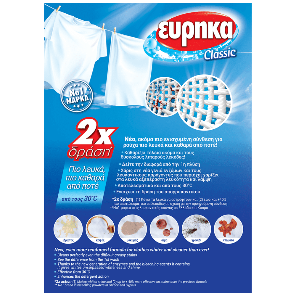 Το Υπερλευκαντικό ΕΥΡΗΚΑ Classic σε ταμπλέτες με τη μοναδική εξελιγμένη σύνθεση και τους λευκαντικούς παράγοντες που περιέχει ενισχύει τη δράση κάθε απορρυπαντικού και απομακρύνει ακόμη και τους πιο δύσκολους λεκέδες, και σε κρύο νερό. Οι ταμπλέτες EYPHKA Classic έχουν αναβράζουσα δράση, διαλύονται τέλεια και δεν αφήνουν κατάλοιπα, ενώ χάρη στην προϋπολογισμένη δόση προσφέρουν ευκολία στη χρήση, οικονομία και εγγυημένο αποτέλεσμα καθαριότητας στα ρούχα.