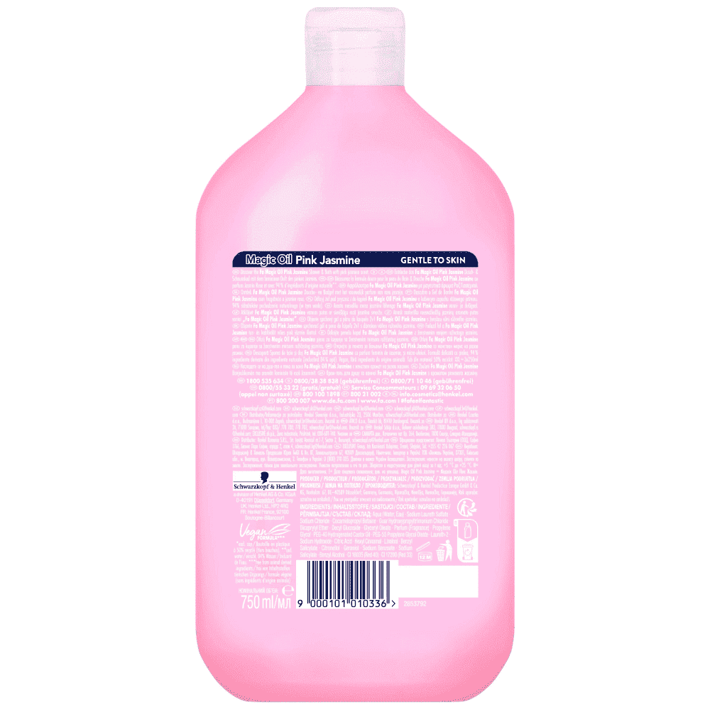 Αφρόλουτρο Fa Magic Oil Pink Jasmine 750ml, με μαγευτικό άρωμα Ροζ Γιασεμιού.Vegan φόρμουλα του Fa που αφήνει την επιδερμίδα απαλή και ενυδατωμένη.Απαλό με την επιδερμίδα, με σεβασμό στο περιβάλλον.Με 94% συστατικά φυσικής προέλευσης.Vegan φόρμουλα.Ανακυκλώστε.Μπουκάλι με 50% ανακυκλωμένο πλαστικό.
