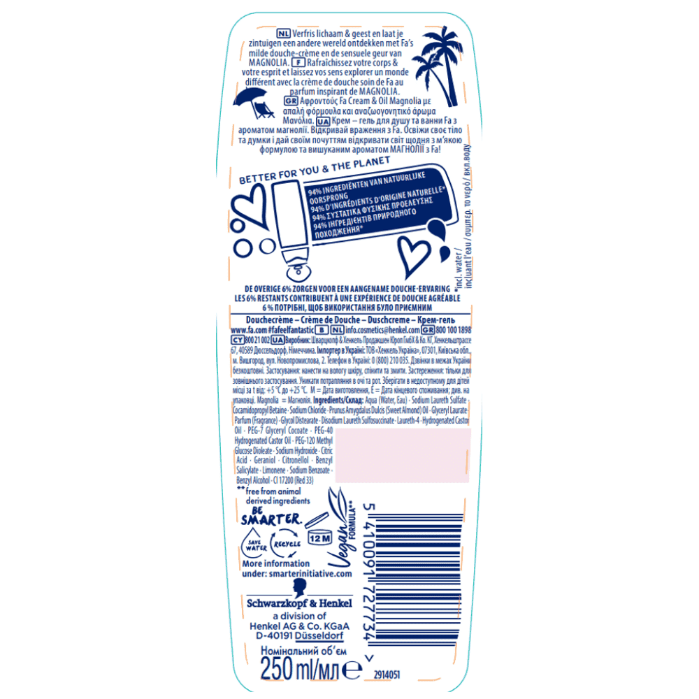 Aqua (Water, Eau), Sodium Laureth Sulfate, Cocamidopropyl Betaine, Sodium Chloride, Prunus Amygdalus Dulcis (Sweet Almond) Oil, Glyceryl Laurate, Parfum (Fragrance), Glycol Distearate, Disodium Laureth Sulfosuccinate, Laureth-4, Hydrogenated Castor Oil, PEG-7 Glyceryl Cocoate, PEG-40 Hydrogenated Castor Oil, PEG-120 Methyl Glucose Dioleate, Sodium Hydroxide, Citric Acid, Geraniol, Citronellol, Benzyl Salicylate, Limonene, Sodium Benzoate, Benzyl Alcohol, CI 17200 (Red 33)