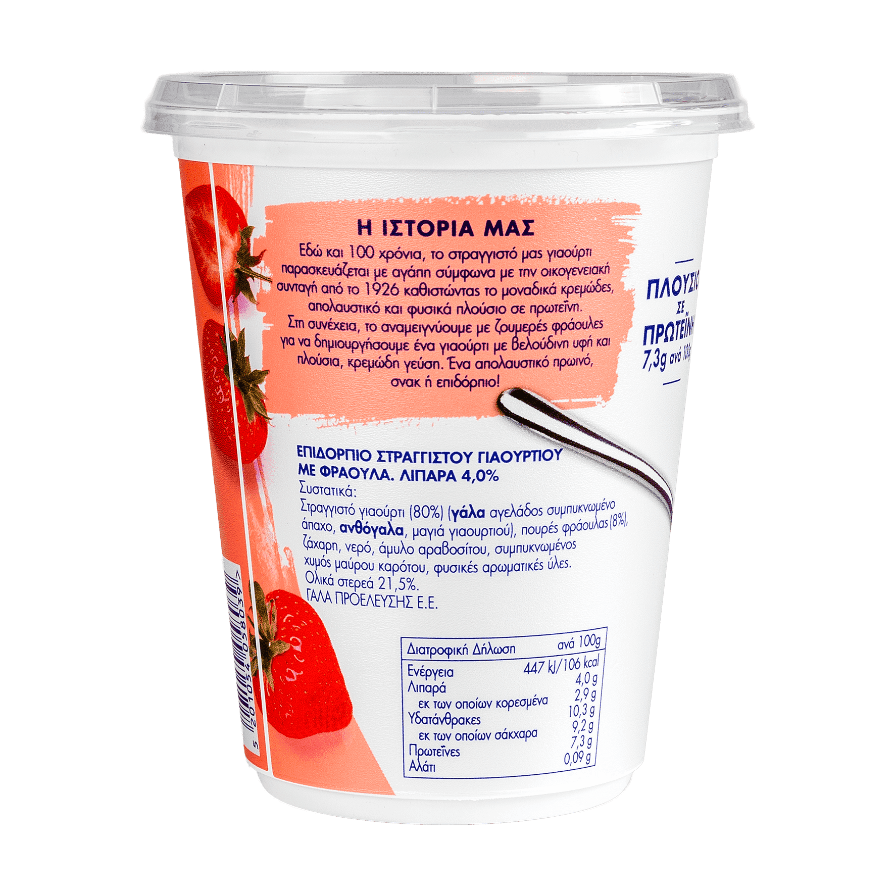 Εδώ και 100 χρόνια, το στραγγιστό μας γιαούρτι παρασκευάζεται με αγάπη σύμφωνα με την οικογενειακή συνταγή από το 1926 καθιστώντας το μοναδικά κρεμώδες, απολαυστικό και φυσικά πλούσιο σε πρωτεΐνη. Στη συνέχεια, το αναμειγνύουμε με ζουμερές φράουλες για να δημιουργήσουμε ένα γιαούρτι με βελούδινη υφή και πλούσια, κρεμώδη γεύση. Ένα απολαυστικό πρωινό, σνακ ή επιδόρπιο!