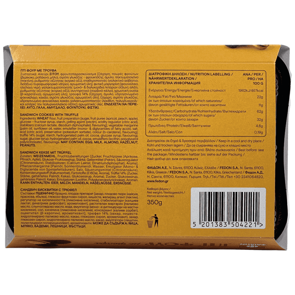 Συστατικά: Αλεύρι σίτου, φυτική μαργαρίνη (φυτικά έλαια & λίπη (φοινικέλαιο, ηλιέλαιο, βαμβακέλαιο), νερό, γαλακτωματοποιητές (μονό- & διγλυκερίδια λιπαρών οξέων, λεκιθίνη), αλάτι, συντηρητικό (σορβικό κάλιο), μέσο οξίνισης (κιτρικό οξύ), αρωματική ύλη, χρωστική ουσία (καροτένια)), ζάχαρη, ορός γάλακτος σκόνη, σιρόπι γλυκόζης, αρωματικές ύλες. Γέμιση: ζάχαρη, φρούτα (βερύκοκο, ροδάκινο), άμυλο, πηκτωματογόνο (πηκτίνη), ρυθμιστής οξύτητας (κιτρικό οξύ), σταθεροποιητές (όξινο κιτρικό ασβέστιο, δισόξινο πυροφωσφορικό νάτριο), αρωματική ύλη. Επικάλυψη: τρούφα 14% (ζάχαρη, άμυλο, φυτικό υδρογονωμένο λίπος (φοινικέλαιο), κακάο, σιρόπι γλυκόζης, αρωματική ύλη), ζάχαρη, φυτικό υδρογονωμένο λίπος (φοινικέλαιο), κακάο, γάλα άπαχο σκόνη, γαλακτωματοποιητές (λεκιθίνη, πολυγλυκερολικοί εστέρες του πολυρικινελαϊκού οξέος), αρωματική ύλη.Αλλεργιογόνα