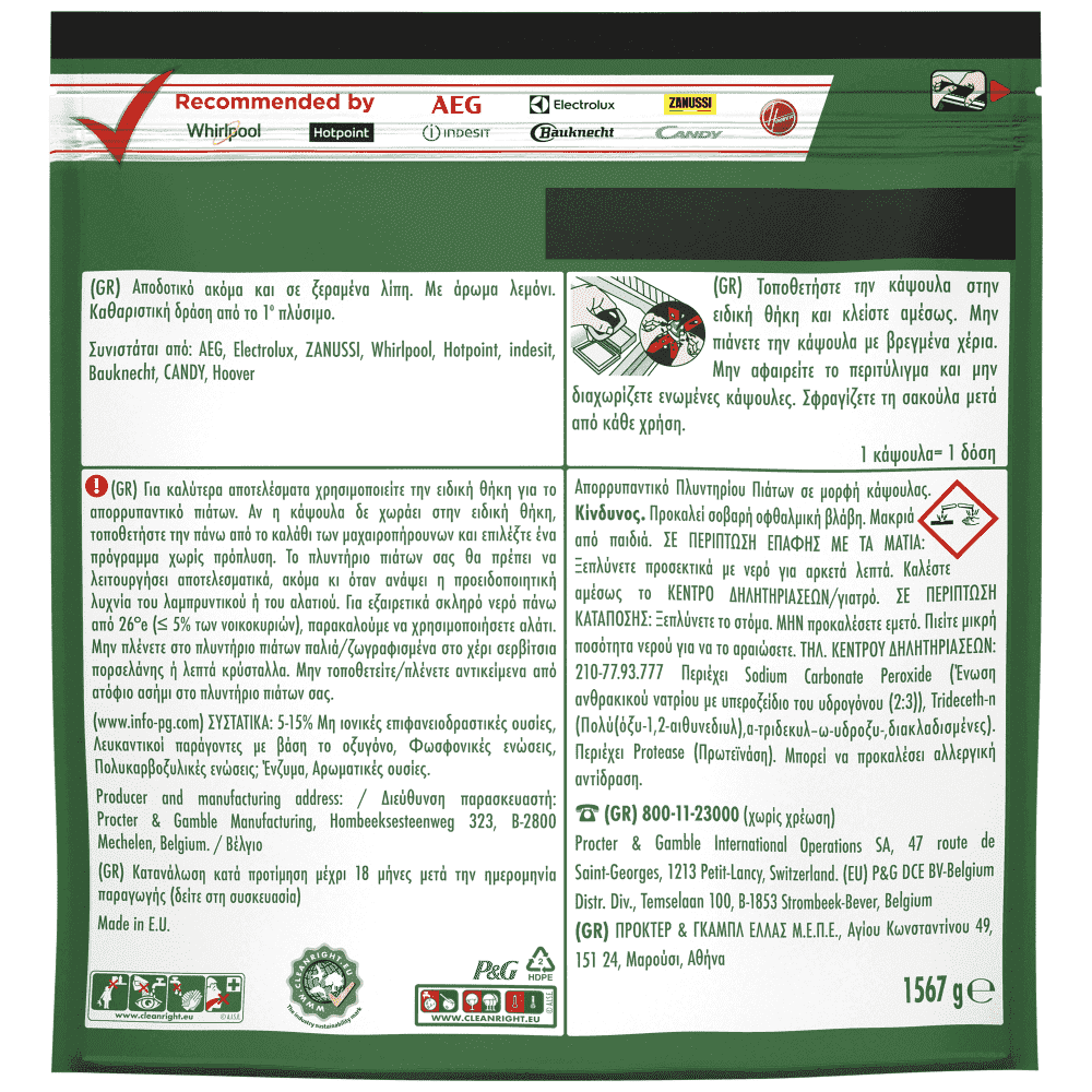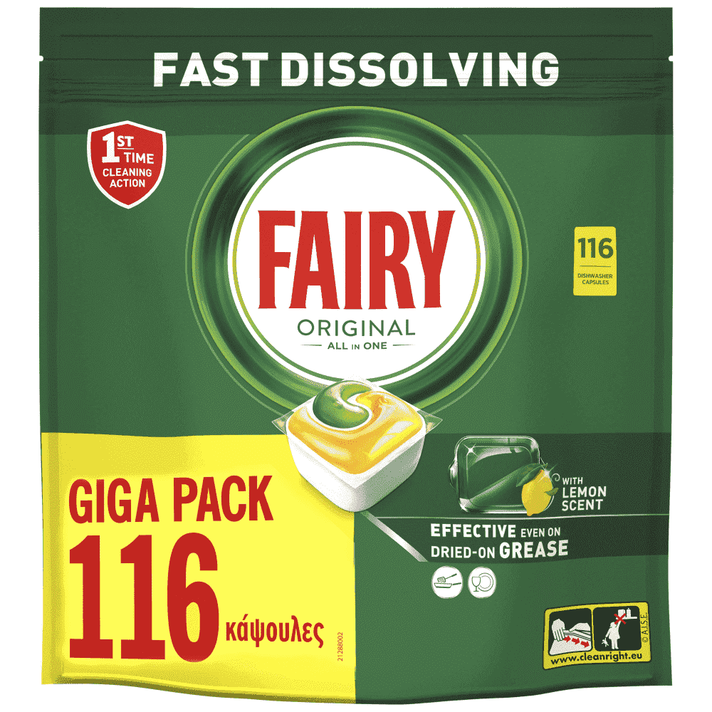 Οι κάψουλες πλυντηρίου πιάτων Fairy Original All in One προσφέρουν καθαριότητα με την πρώτη, ακόμη και στα ξεραμένα λίπη. Οι κάψουλες συνδυάζουν υγρό πιάτων και απορρυπαντικό σε σκόνη σε μία κάψουλα. Η εξαιρετικά διαλυτή μεμβράνη τους διασπάται ταχύτατα, ξεκινώντας άμεσα τον καθαρισμό. Και είναι απίστευτα εύκολες στη χρήση! Δεν χρειάζεται να αφαιρέσετε τη μεμβράνη, απλά τοποθετήστε τις στη θήκη του απορρυπαντικού.