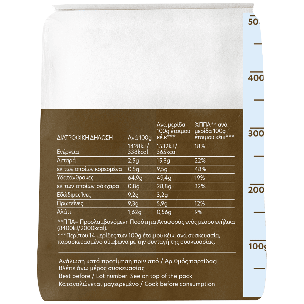 | **ΠΠΑ= Προσλαμβανόμενη Ποσότητα Αναφοράς ενός μέσου ενήλικα (8400kJ/2000kcal). ***Περίπου 14 μερίδες των 100g έτοιμου κέικ, ανά συσκευασία, παρασκευασμένο σύμφωνα με την συνταγή της συσκευασίας. |