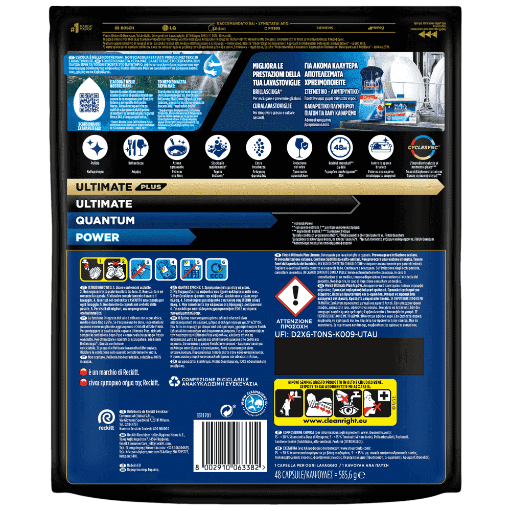 O Finish είναι η #1 μάρκα που συνιστάται από τους μεγαλύτερους κατασκευαστές πλυντηρίου πιάτων. ΤΟ ΝΕΡΟ ΕΙΝΑΙ ΣΤΑ ΧΕΡΙΑ ΜΑΣ: Συχνά σπαταλάμε το νερό χωρίς να συνειδητοποιούμε τις συνέπειες. Βάζοντας ΤΕΛΟΣ στο ξέβγαλμα των πιάτων μπορείτε να εξοικονομήσετε έως και 40L* νερό κάθε φορά. Finish Ultimate Plus All in 1, για απόλυτη καθαριότητα και διαμαντένια λάμψη από την 1η φορά και κάθε φορά. Είναι η πρώτη μας κάψουλα με τεχνολογία CYCLESYNC, η οποία απελευθερώνει το κατάλληλο συστατικό** για δράση τη σωστή στιγμή του κύκλου πλύσης. Η προηγμένη σύνθεσή της είναι αποτελεσματική στην αφαίρεση ακόμα και καμένων υπολειμμάτων φαγητού χωρίς ξέβγαλμα, προσφέροντας 4 δράσεις κατά τη διάρκεια του κύκλου πλύσης. Οι κάψουλες προστατεύουν και φροντίζουν τα γυάλινα σκεύη και τα μαχαιροπίρουνά σας, διατηρώντας τη λάμψη τους σε κάθε πλύση. *Σύμφωνα με: Αυστραλιανή Στατιστική Υπηρεσία, Nielsen Homescan & Παγκόσμια Έρευνα Finish σχετικά με τη χρήση του πλυντηρίου πιάτων. Η εξοικονόμηση νερού επιτυγχάνεται με τη διακοπή της διαδικασίας του ξεβγάλματος των πιάτων. ** Συστατικό: Ένζυμο