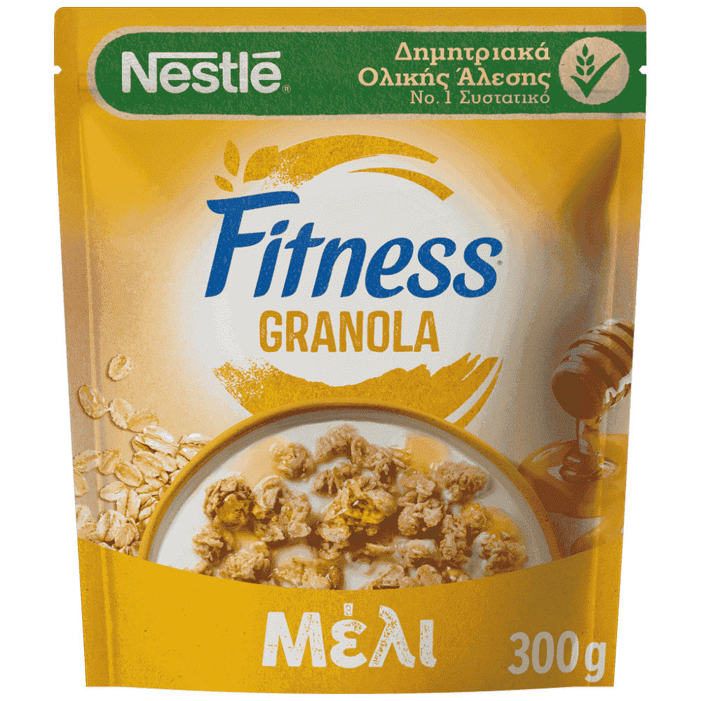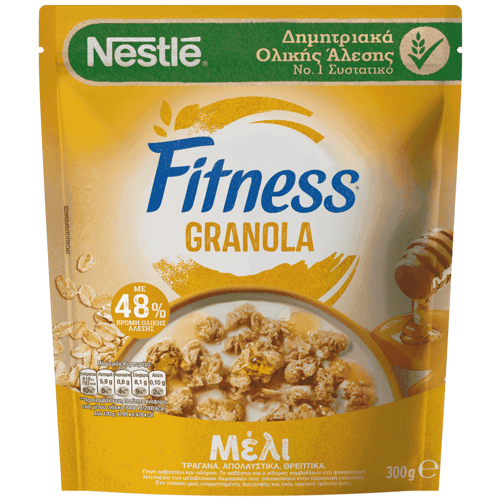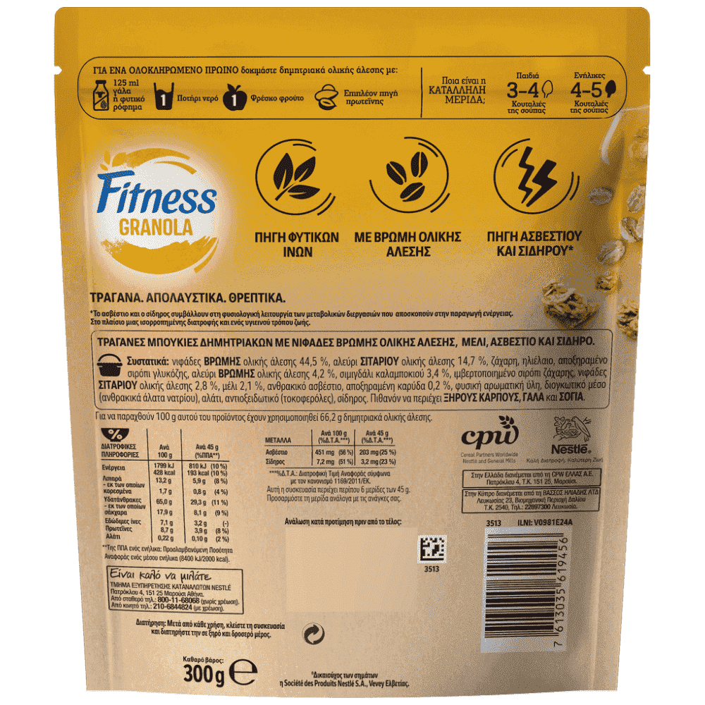 Νιφάδες ΒΡΩΜΗΣ ολικής άλεσης 44,5%, αλεύρι ΣΙΤΑΡΙΟΥ ολικής άλεσης 14,7%, ζάχαρη, ηλιέλαιο, αποξηραμένο σιρόπι γλυκόζης, αλεύρι ΒΡΩΜΗΣ ολικής άλεσης 4,2%, σιμιγδάλι καλαμποκιού 3,4%, ιμβερτοποιημένο σιρόπι ζάχαρης, νιφάδες ΣΙΤΑΡΙΟΥ ολικής άλεσης 2,8%, μέλι 2,1%, ανθρακικό ασβέστιο, αποξηραμένη καρύδα 0,2%, φυσική αρωματική ύλη, διογκωτικό μέσο (ανθρακικά άλατα νατρίου), αλάτι, αντιοξειδωτικό (τοκοφερόλες), σίδηρος. Πιθανόν να περιέχει ΞΗΡΟΥΣ ΚΑΡΠΟΥΣ, ΓΑΛΑ και ΣΟΓΙΑ.Αλλεργιογόνα