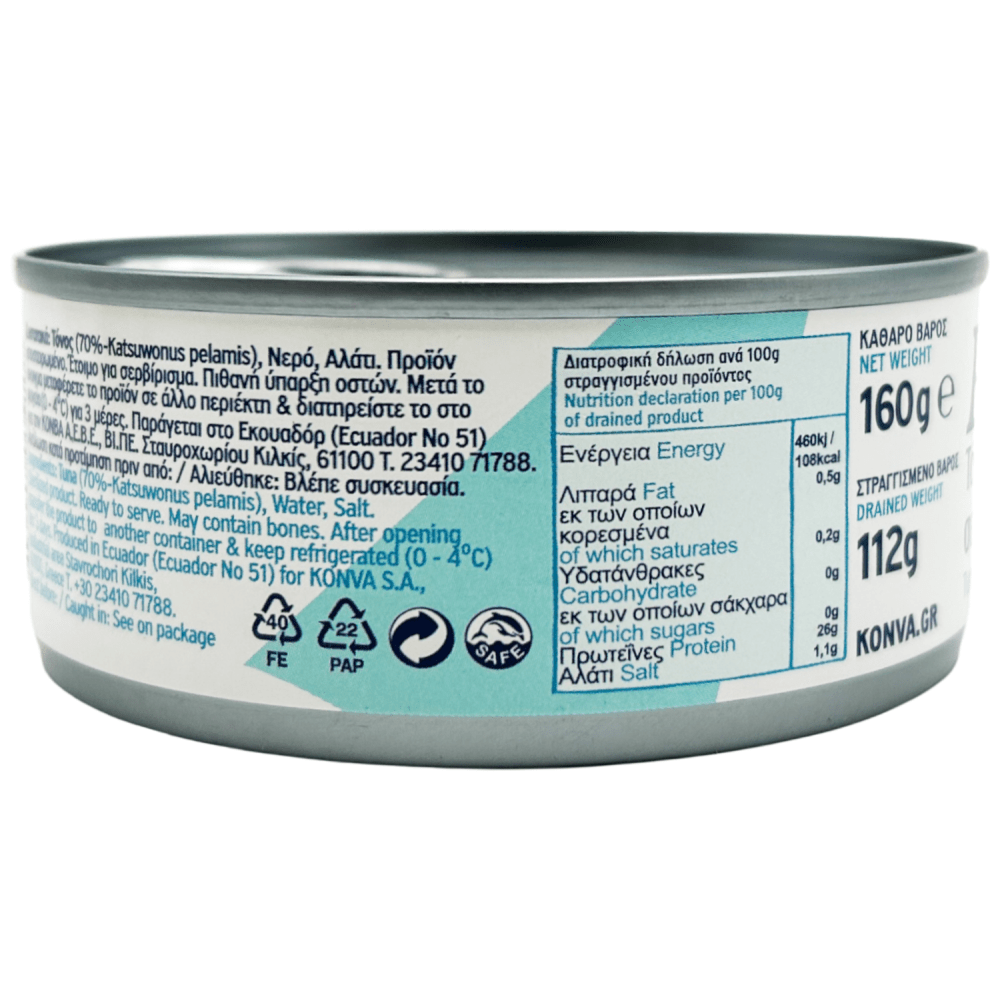 Επιλέγουμε και προμηθευόμαστε τον τόνο, καθαρισμένο και προ βρασμένο, από επιλεγμένους προμηθευτές και αφού περάσει από τους απαραίτητους ποιοτικούς ελέγχους, τοποθετείται στις κονσέρβες. Η συντήρηση του τόνου σε νερό προσφέρει ένα θρεπτικό προϊόν με ελάχιστες θερμίδες, ιδανικό για διατροφή χωρίς λιπαρά