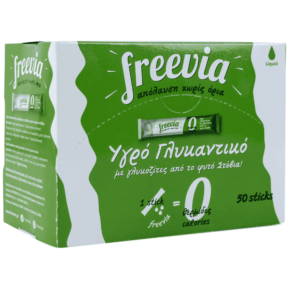Υγρό γλυκαντικό (1 στικ = 1ml = 6g ζάχαρης). Έτοιμο προς κατανάλωση. Για κρύα και ζεστά ροφήματα, χωρίς πικρή επίγευση. 1 φακελάκι freevia (0 θερμίδες) = 1 φακελάκι ζάχαρη (20 θερμίδες)