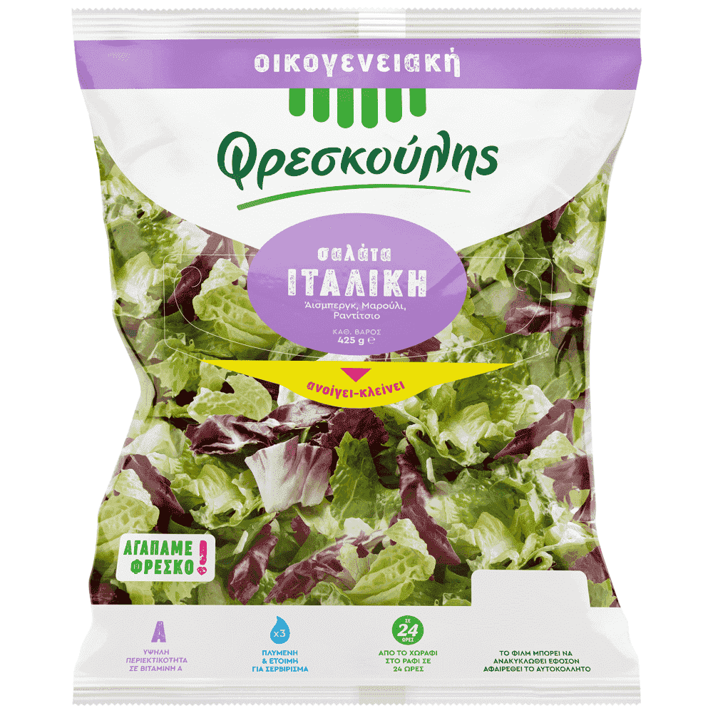 Η Ιταλική σαλάτα οικογενειακή είναι μια από τις φρέσκες σαλάτες του Φρεσκούλης. Περιέχει βιταμίνες, ενω είναι πλυμένη και φρεσκομμένη για άμεσο σερβίρισμα. Η Ιταλική σαλάτα οικογενειακή είναι ιδανική για ένα υγιεινό γεύμα με τους φίλους και την οικογένειά σας, ενώ συνδυάζεται με πάρα πολλά υλικά.