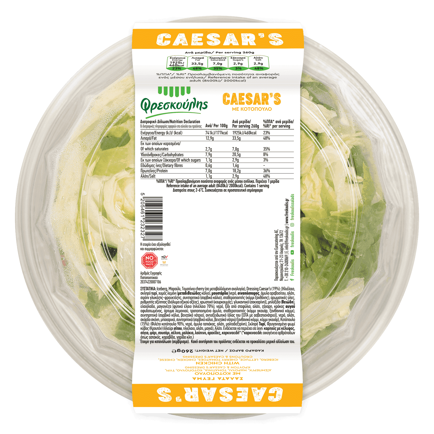 Η Σαλάτα γεύμα caesars είναι η ιδανική λύση για ένα γρήγορο, γευστικό και υγιεινό γεύμα μέσα σε μια ημέρα. Τα φρέσκα λαχανικά, σε συνδυασμό με το κοτόπουλο, το κρουτόν και την παρμεζάνα, δένουν υπέροχα με τη caesar σως, δημιουργώντας έτσι ένα απολαυστικό αποτέλεσμα. Όπως όλα τα προϊόντα της σειράς υγιεινά γεύματα & σνακ του Φρεσκούλη, είναι έτοιμη για σερβίρισμα. Περιέχει αλάτι, dressing και ξύλινο πηρουνάκι. Γευτείτε την στο σπίτι, στο γραφείο, στην βόλτα, μεσημέρι ή βράδυ. Με τον Φρεσκούλη είναι τόσο εύκολο να τρώμε σωστά!