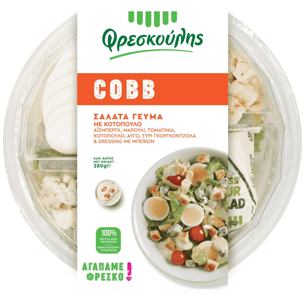 Η Σαλάτα Γεύμα Cobb αποτελεί μια νόστιμη επιλογή, που σας δίνει άφθονη ενέργεια καθώς έχει υψηλή περιεκτικότητα σε πρωτεΐνη. Πρόκειται για μια πολύ χορταστική, πλούσια σε γεύση σαλάτα, η οποία προσφέρει ακόμη μια επιλογή για όσους επιθυμούν ένα εύκολο, γρήγορο και υγιεινό γεύμα χωρίς να συμβιβάζονται στη γεύση. Όπως όλα τα προϊόντα της σειράς υγιεινά γεύματα & σνακ του Φρεσκούλη, είναι έτοιμη για σερβίρισμα. Περιέχει αλάτι, dressing και ξύλινο πηρουνάκι. Γευτείτε την στο σπίτι, στο γραφείο, στην βόλτα, μεσημέρι ή βράδυ. Με τον Φρεσκούλη είναι τόσο εύκολο να τρώμε σωστά!