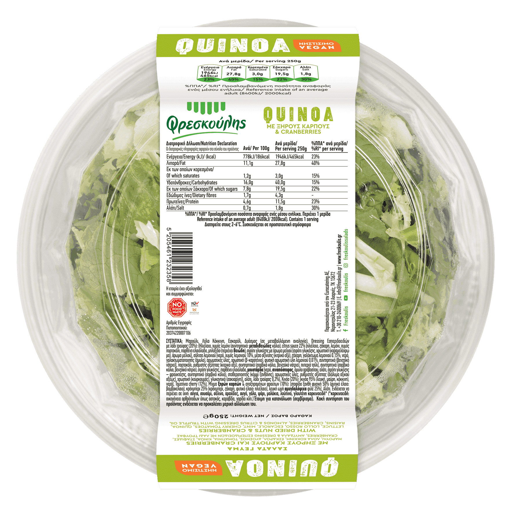 Η Σαλάτα Γεύμα Quinoa αποτελεί μια σούπερ γευστική σαλάτα, ιδανική για κάθε στιγμή της ημέρας σας. Εξερευνήστε ένα πλούσιο σε θρεπτική αξία γεύμα, που είναι εξαιρετική πηγή μαγνησίου, ασβεστίου, φυτικών ινών, βιταμινών και φυλλικού οξέος. Απολαύστε την ευφάνταστη σαλάτα με quinoa απευθείας από την πρακτική συσκευασία της, όπως όλα τα υγιεινά σνακ του Φρεσκούλη. Εκτοξεύστε την ενέργειά σας με τα super foods που περιέχει και ακολουθήστε με ευκολία την vegan διατροφή σας. Όπως όλα τα προϊόντα της σειράς υγιεινά γεύματα & σνακ του Φρεσκούλη, είναι έτοιμη για σερβίρισμα. Περιέχει αλάτι, dressing και ξύλινο πηρουνάκι. Γευτείτε την στο σπίτι, στο γραφείο, στην βόλτα, μεσημέρι ή βράδυ. Με τον Φρεσκούλη είναι τόσο εύκολο να τρώμε σωστά!