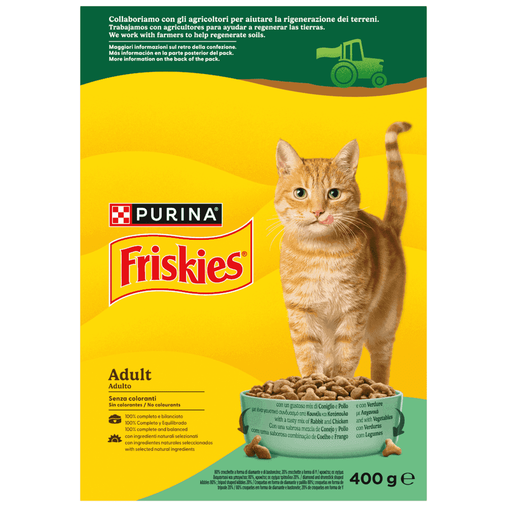 Ξηρή Τροφή Γάτας FRISKIES ΚΟΥΝΕΛΙ, ΚΟΤΟΠΟΥΛΟ & ΠΡΟΣΘΕΤΑ ΛΑΧΑΝΙΚΑ 400g. Οι γάτες είναι εξερευνητές από τη φύση τους, αντιλαμβάνονται τα πάντα στο περιβάλλον τους. Αυτό είναι που τις κάνει τόσο γοητευτικά και ενεργά μέλη της οικογένειας. Γι' αυτό οι ειδικοί της Purina® έχουν δημιουργήσει τα Friskies® για ενήλικες γάτες: νόστιμη, ποιοτική τροφή για γάτες, που θρέφει το αστείρευτο ενδιαφέρον του εξερευνητή σας για τον κόσμο.