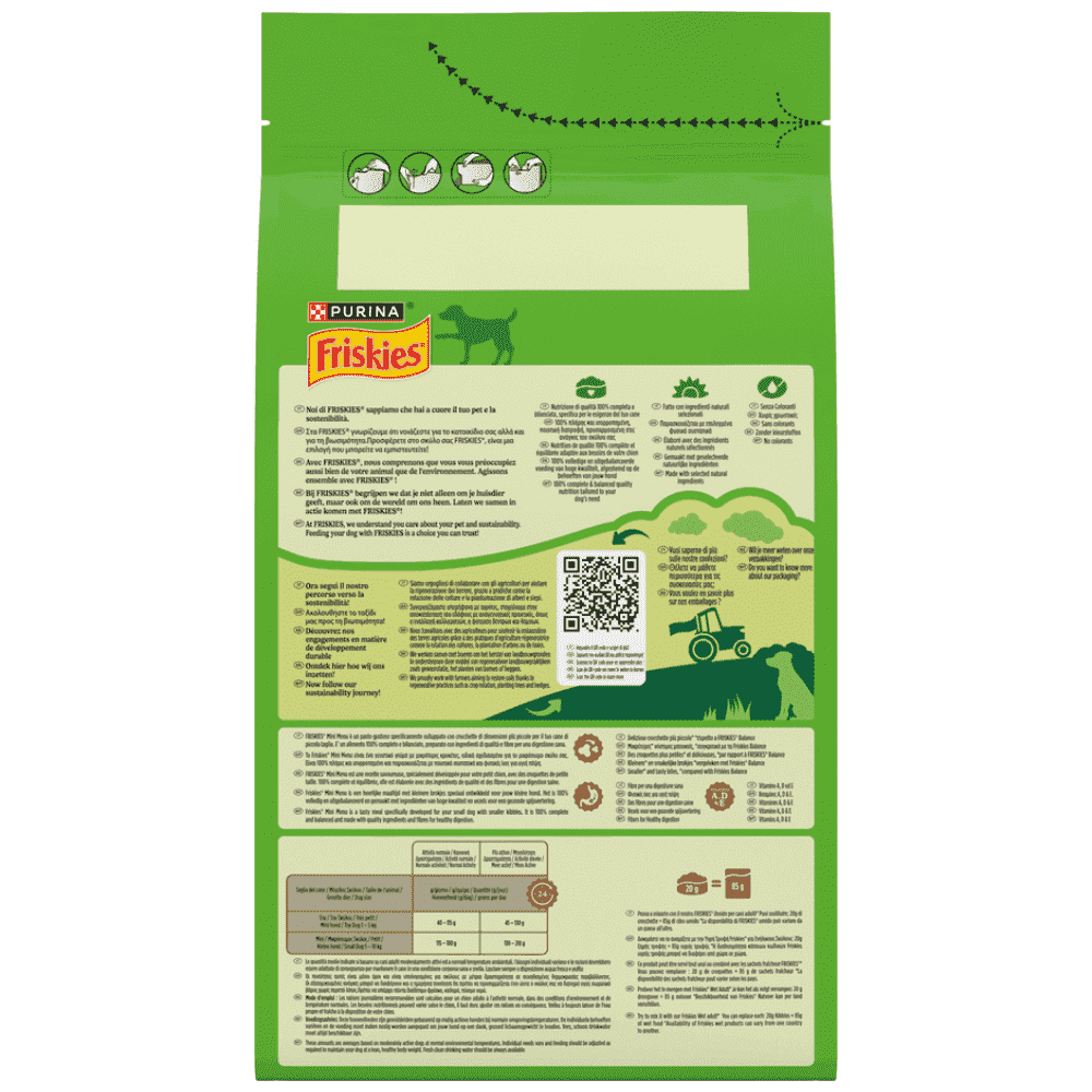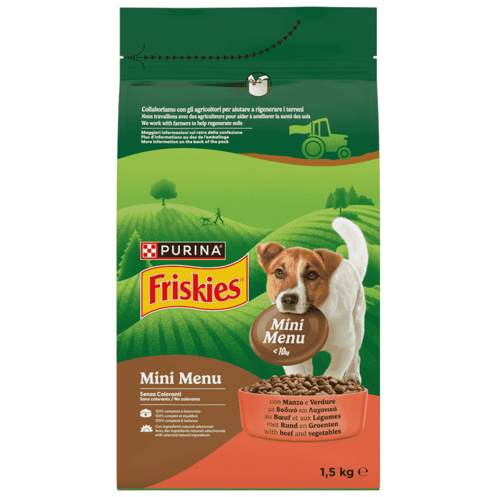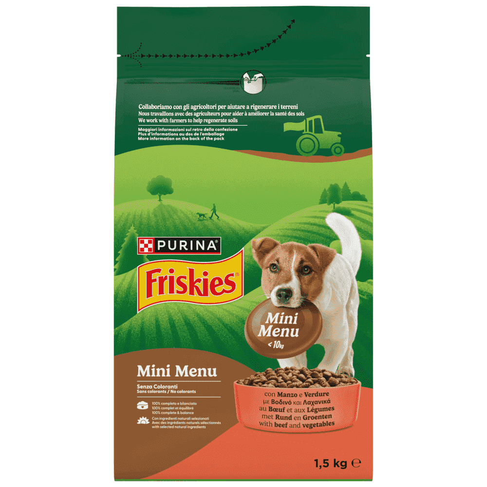 Friskies Mini Menu Ξηρή τροφή για ενήλικους Μικρόσωμους Σκύλους Βοδινό 6x1,5Kg. Το PURINA® Friskies® Mini Menu με Βοδινό είναι μια γευστική συνταγή με βοδινό, συνδυασμένη με δημητριακά ολικής άλεσης, βιταμίνες Β και Ωμέγα 3 & 6 λιπαρά οξέα.Το Friskies® Mini Menu είναι ένα γευστικό γεύμα ειδικά σχεδιασμένο για το μικρόσωμο σκύλο σας με μικρότερες κροκέτες.Είναι 100% πλήρης και ισορροπημένη και παρασκευασμένη με ποιοτικά συστατικά και φυτικές ίνες για υγιή πέψη.