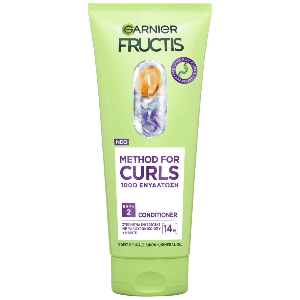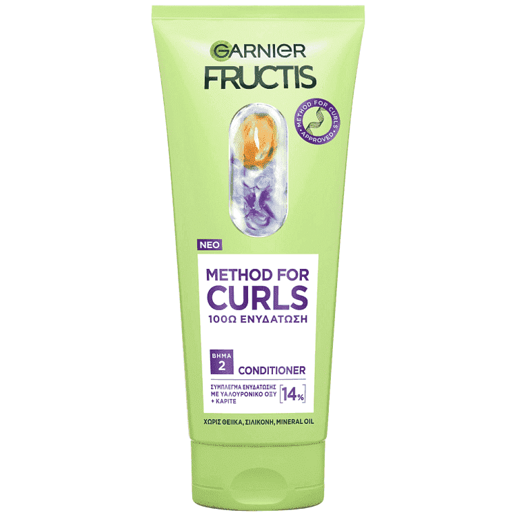 "Hair Fact: Λόγω της ευαίσθητης δομής τους, οι μπούκλες αφυδατώνονται εύκολα. Το νέο Fructis Method For Curls Βήμα 2 Conditioner προσφέρει εντατική ενυδάτωση στην τρίχα για έως και 100 ώρες (1). Εμπλουτισμένο με: