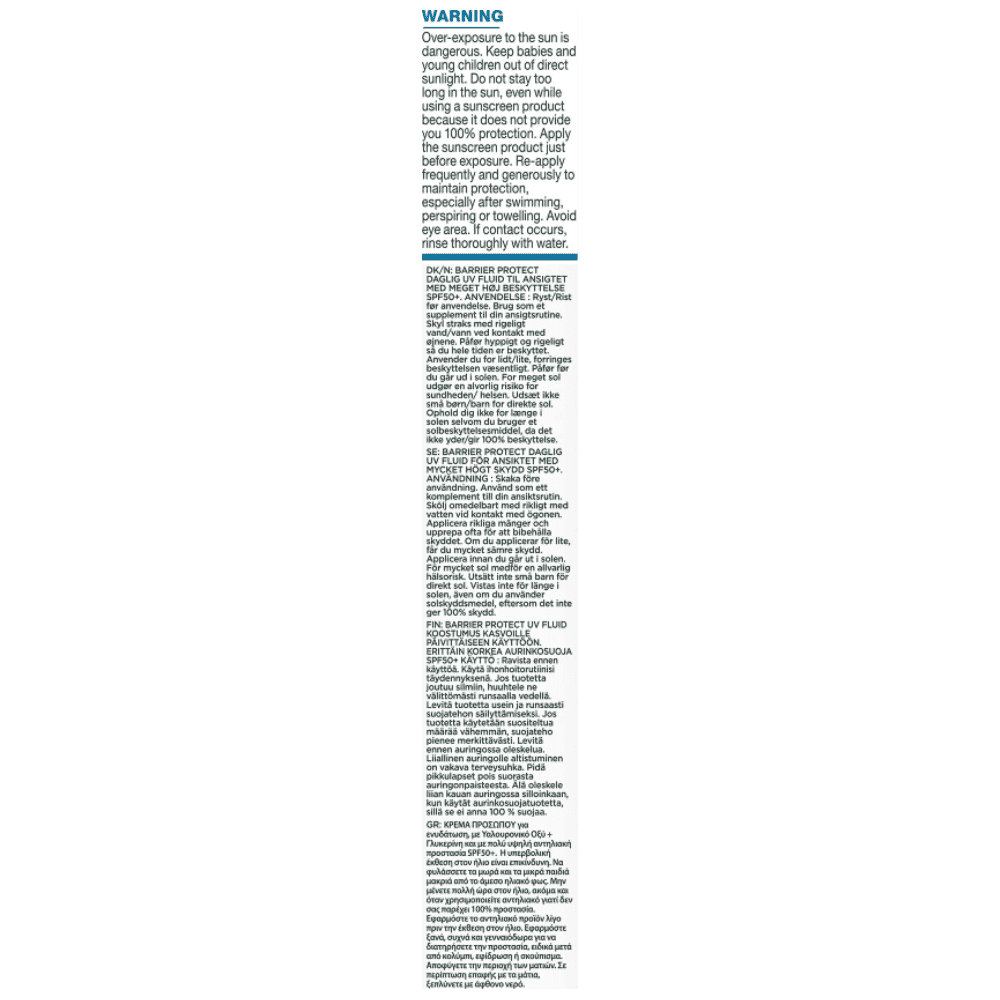 "Κρέμα προσώπου με πολύ υψηλή αντηλιακή προστασίας SPF50+ που επιδιορθώνει τον επιδερμικό φραγμό, με λεπτόρρευστη υφή. Ενυδάτωση όλη την ημέρα, αντηλιακή προστασίας SPF50+, πιο λεία & λαμπερή επιδερμίδα. Εμπλουτισμένη με Γλυκερίνη & Υαλουρονικό Οξύ. Γλυκερίνη: Ενυδατικό συστατικό που υποστηρίζει τον επιδερμικό φραγμό. Υαλουρονικό Οξύ: ισχυρό ενυδατικό συστατικό που κρατάει έως και 1000 φορές το βάρος του σε νερό. Δερματολογικά ελεγμένο για ευαίσθητες επιδερμίδες.