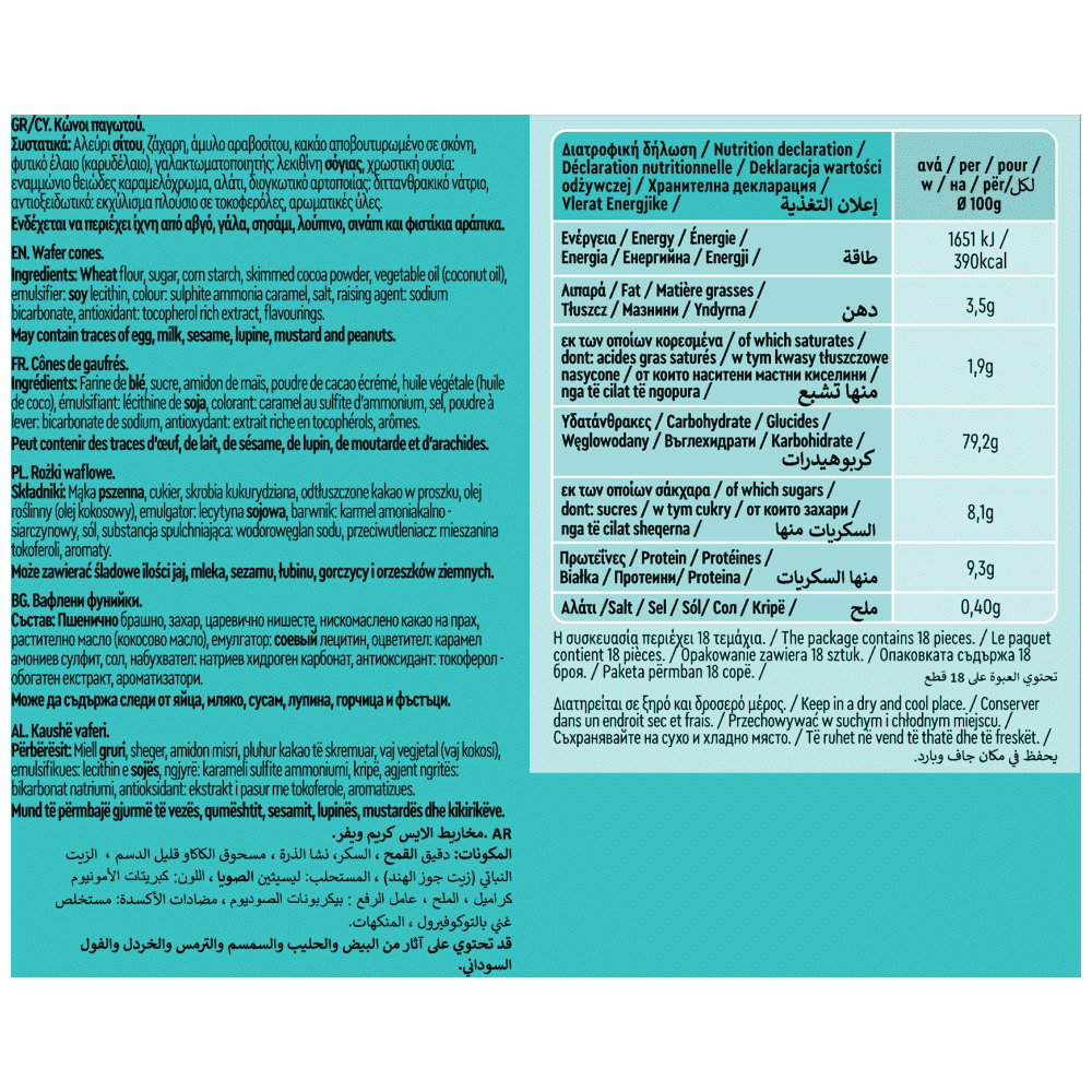 αλεύρι ΣΙΤΟΥ, άμυλο αραβοσίτου, κακάο αποβουτυρωμένο σε σκόνη, φυτικό έλαιο (καρυδέλαιο), γαλακτωματοποιητής: λεκιθίνη ΣΟΓΙΑΣ, χρωστική ουσία: εναμμώνιο θειώδες καραμελόχρωμα, αλάτι, διογκωτικό αρτοποιίας: διττανθρακικό νάτριο, αντιοξειδωτικό: εκχύλισμα πλούσιο σε τοκοφερόλες, αρωματικές ύλες.Αλλεργιογόνα