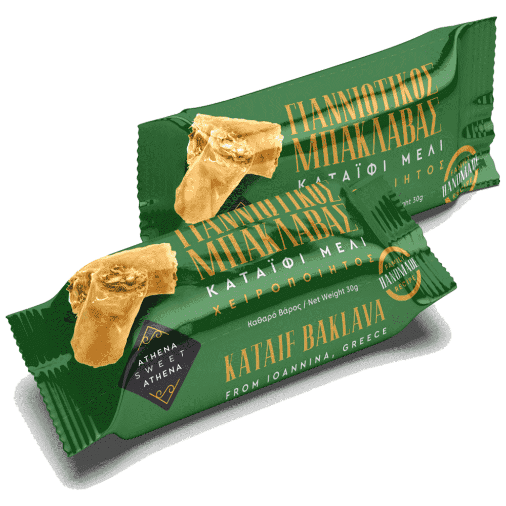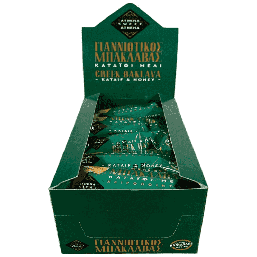 Αλεύρι σίτου (περιέχει γλουτένη), ζάχαρη, γλυκόζη, φυτικό έλαιο (φοινικέλαιο), καταϊφι 6%( Αλεύρι σίτου,άμυλο,συντηρητικό (σορβικό κάλιο),λεκιθίνη σόγιας),καρύδι,αμύγδαλο,μέλι (2%), φυσικός χυμός πορτοκαλιού, κανέλα,γαρύφαλλο,αλάτι,μέσο οξίνισης (κιτρικό οξύ),διογκωτικό (όξινο ανθρακικό νάτριο), συντηρητικό(σορβικό κάλιο).Περιέχει γλουτένη,σόγια και ξηρούς καρπούς με κέλυφος. Μπορεί να περιέχει ίχνη από σουσάμι και άλλους ξηρούς καρπούς με κέλυφος.Παρά την προσοχή που δόθηκε στην παρασκευή του, το προϊόν μπορεί να περιέχει κομμάτια από κέλυφος.Αλλεργιογόνα