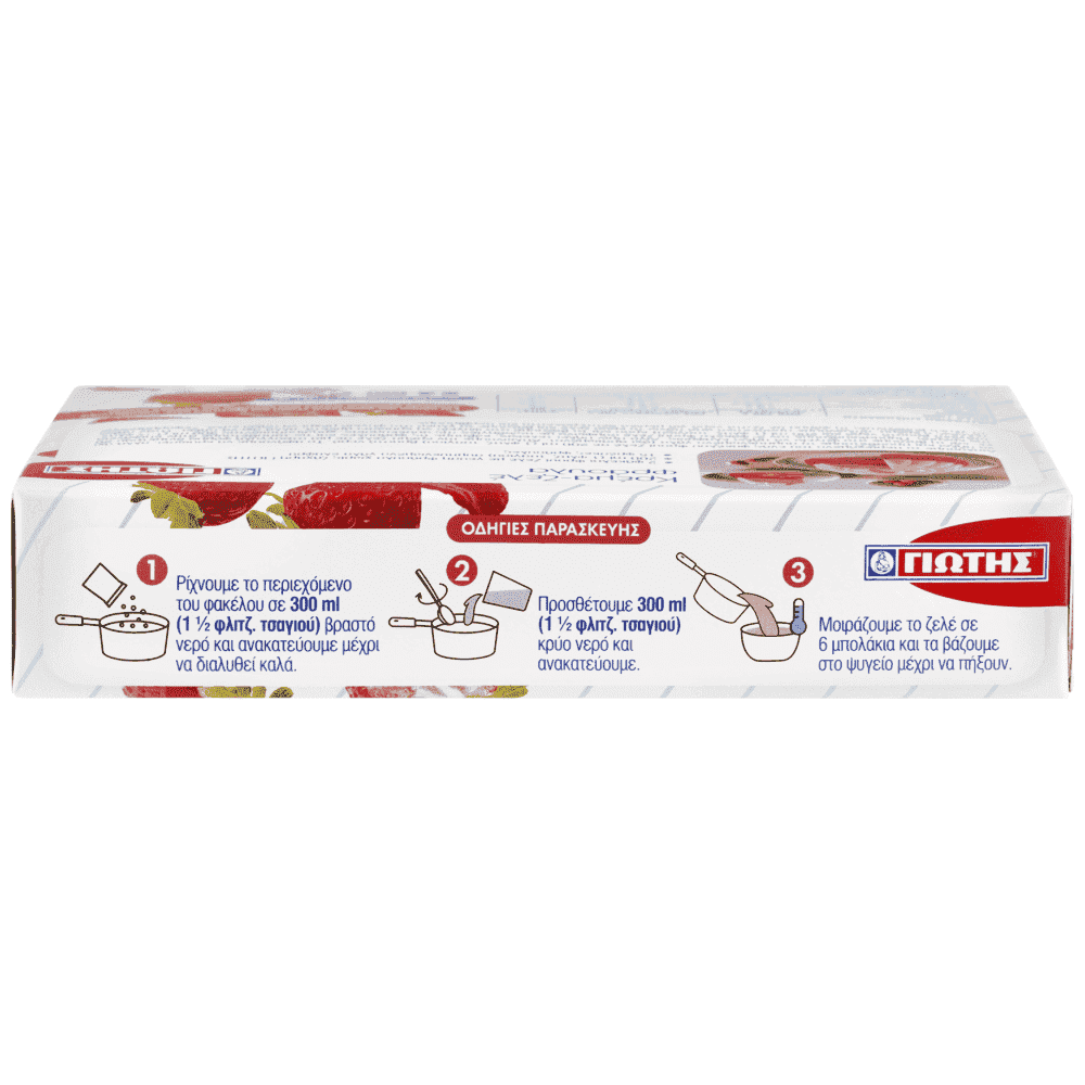 1. Διαλύετε το περιεχόμενο του φακέλου σε 300 ml (11/2 φλιτζ. τσαγιού) βραστό Nερό και ανακατεύετε μέχρι να διαλυθεί καλά. 2. Προσθέτετε 300 ml (11/2 φλιτζ. τσαγιού) παγωμένο Nερό και ανακατεύετε. 3. Mοιράζετε το Zελέ σε 5 φορμάκια ή μπολάκια και τα βάζετ