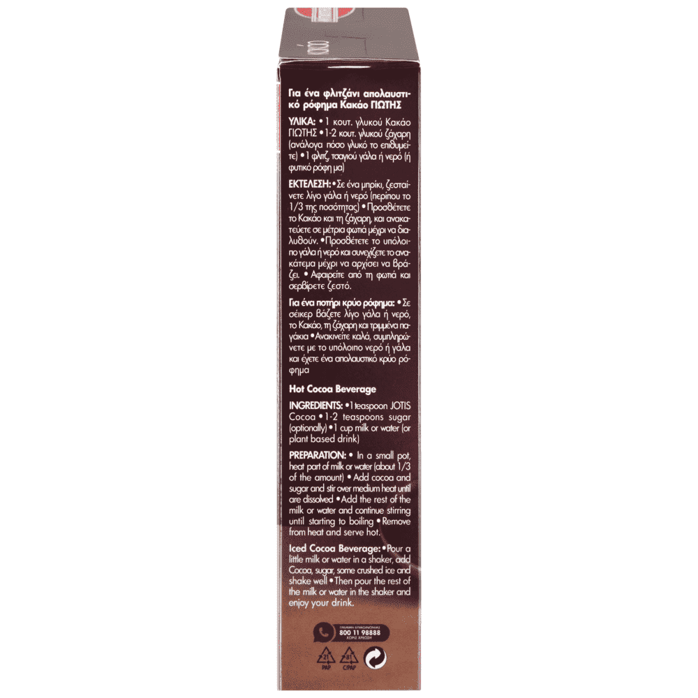 Το Κακάο ΓΙΩΤΗΣ είναι υψηλής ποιότητας, με πλούσια γεύση και άρωμα που συναρπάζει. Εκτός από απολαυστικό ρόφημα, αποτελεί και ένα πολύτιμο υλικό για τη ζαχαροπλαστική σας, καθώς μπορείτε να το χρησιμοποιήσετε για να ετοιμάσετε σοκολατένια κέικ, τρουφάκια, κρέμες, αλλά και να διακοσμήσετε το τιραμισού και τα άλλα γλυκίσματα.Το προϊόν πρέπει να διατηρείται σε μέρος ξηρό και δροσερό χωρίς μυρωδιές και έντομα.