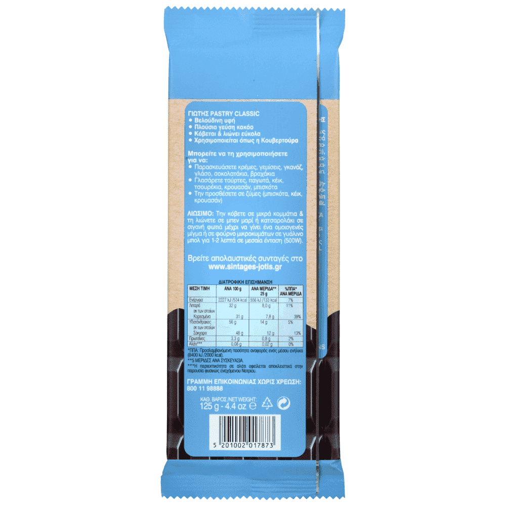 "ΓΙΑ ΝΑ ΛΙΩΣΕΤΕ ΤΗΝ Classic Pastry ΓΙΩΤΗΣ :Κόβετε το προιόν σε μικρά κομμάτια και τη λιώνετε σε μπεν μαρί ή κατσαρολάκι σε σιγανή φωτιά μέχρι να γίνει ένα ομοιογενές μίγμα , ή σε φούρνο μικροκυμάτων σε ένα γυάλινο μπολ για 1 με 2 λεπτά σε μεσαία ένταση (500W)
