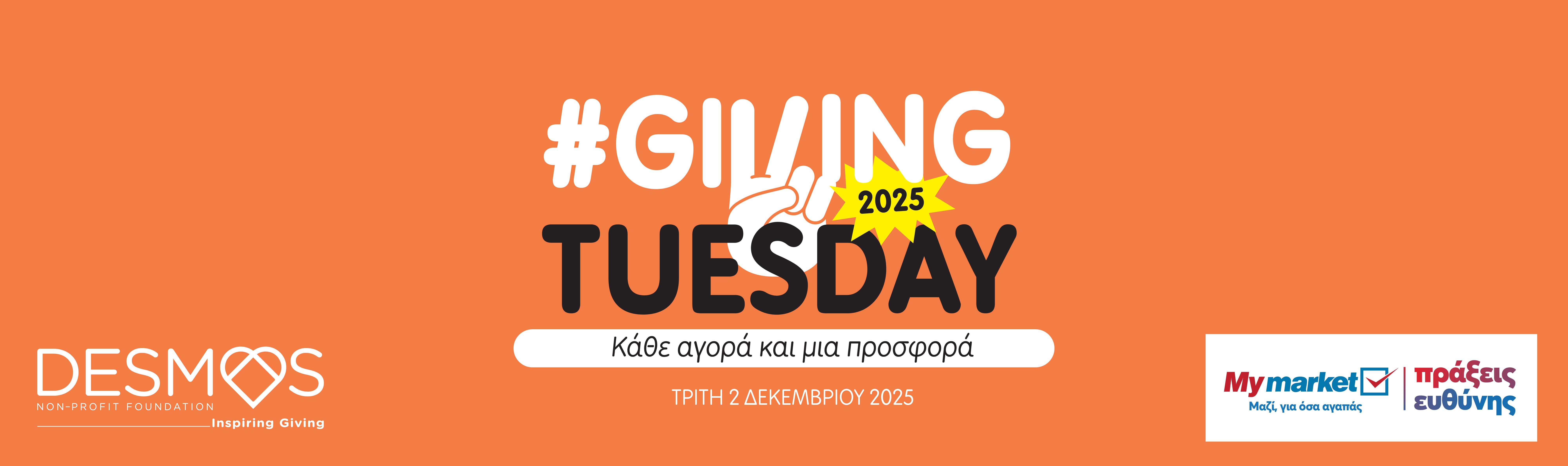 Την Τρίτη 02 Δεκεμβρίου 2025 και για 4η συνεχόμενη χρονιά, τα My market στηρίζουν το κοινωνικό έργο του ΜΚΣ ΔΕΣΜΟΣ στο πλαίσιο της Παγκόσμιας Ημέρας Προσφοράς #GIVINGTUESDAY.