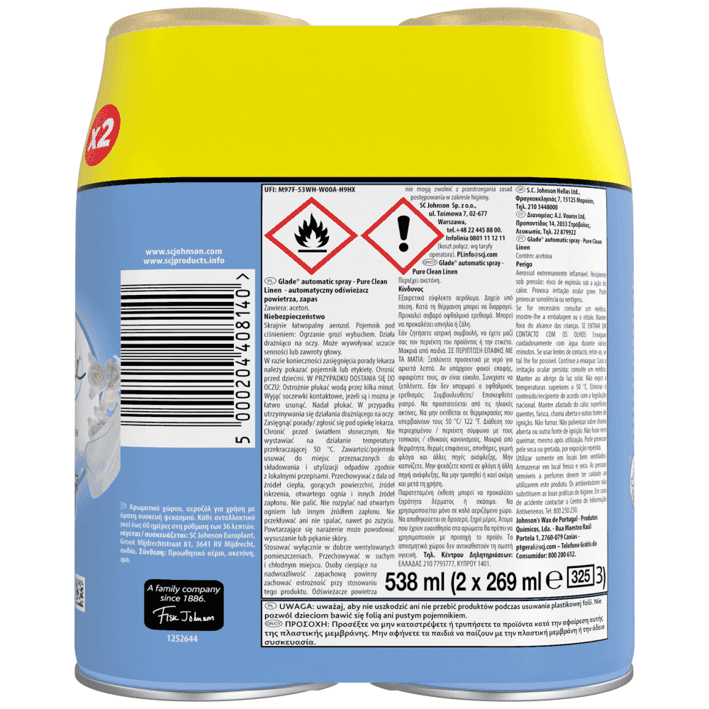 "Το Glade Automatic Spray προσφέρει υπέροχο άρωμα τη μια εβδομάδα μετά την άλλη, αυτόματα. Με 2 τρόπους ψεκασμού: 1. Ρύθμιση χρονοδιακόπτη 2. Κουμπί extra ψεκασμού. PURE CLEAN LINEN : Χαλαρώστε και απολαύστε μια αίσθηση καθαριότητας σαν τα φρεσκοπλυμένα σας σεντόνια. "