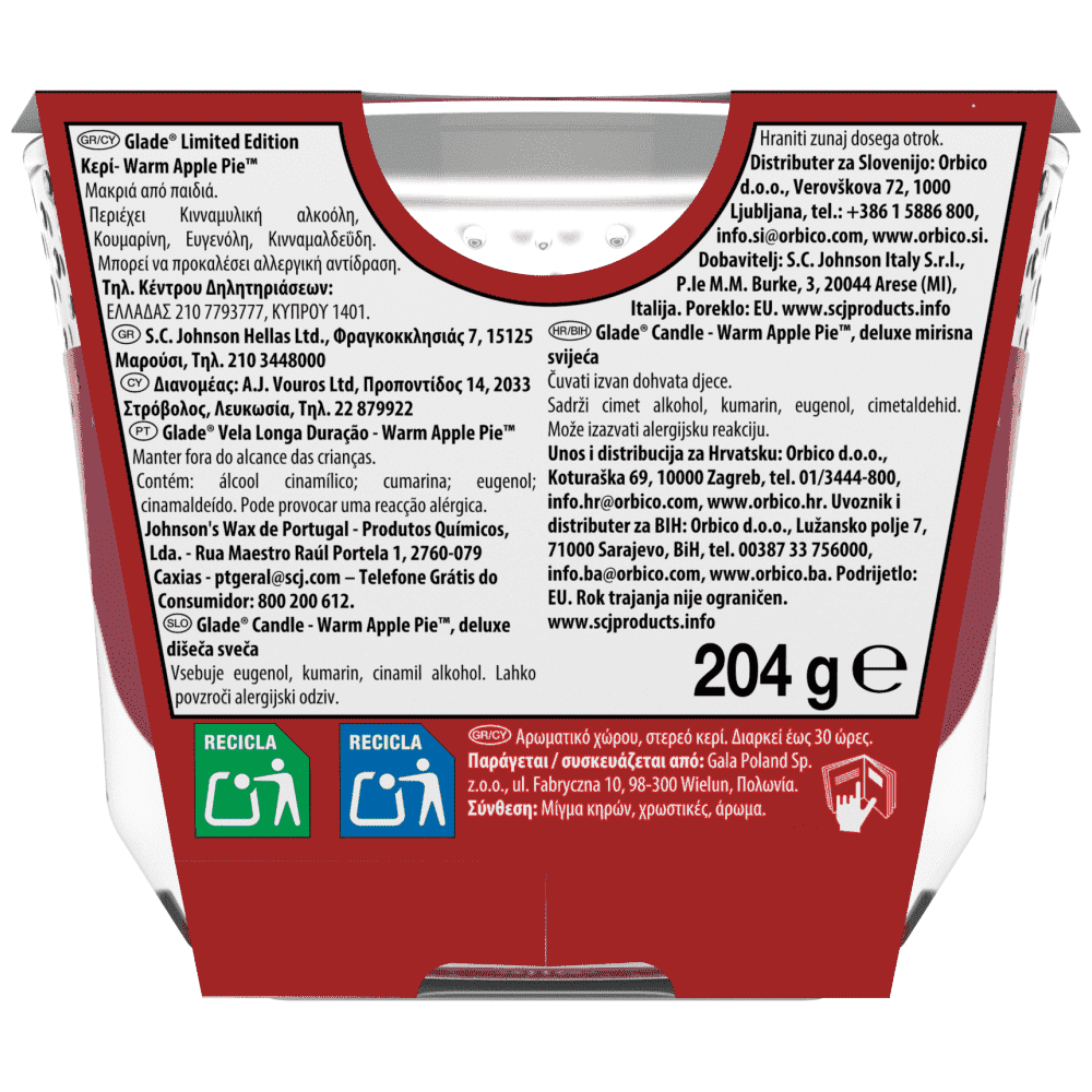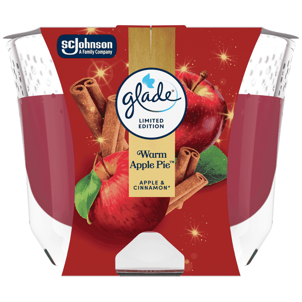 "Προσφέρει άρωμα που διαρκεί έως 39 ώρες. ΝΟΤΕΣ ΑΠΟ ΜΗΛΟ & ΚΑΝΕΛΑ Ζήστε τη απόλυτη άνεση και τη γλυκιά απόλαυση αυτού του limited edition αρωματικού κεριού Glade Warm Apple Pie, καθώς μεταμορφώνει το περιβάλλον σας σε ένα χώρο χαλάρωσης, ζεστασιάς και μια νότα απολαυστικής γλυκύτητας."