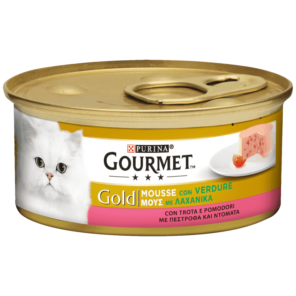 GOURMET GOLD αποτελεί μια μαλακή μούς με πέστροφα και ντομάτα, προσεκτικά προετοιμασμένη για να προσφέρει στη γάτα σας την απόλαυση μιας φίνας, απαλής αίσθησης καλύπτοντας παράλληλα όλες τις διατροφικές της ανάγκες.