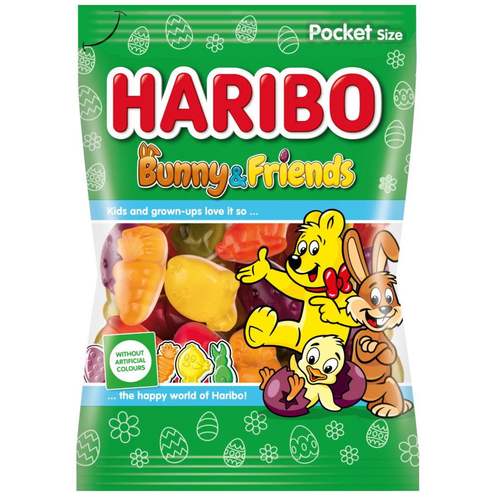 Σιρόπι γλυκόζης, ζάχαρη, σταφυλοσάκχαρο, ζελατίνη, οξύ: κιτρικό οξύ, ηλιέλαιο, συμπυκνώματα φρούτων και φυτών: καρθάκος, σπιρουλίνα, μήλο, ακτινίδιο, καρότο, βατόμουρο, σαμπούκος, πορτοκάλι, μαύρη σταφίδα, λεμόνι, αρώνια, φρούτο του πάθους, σταφύλι, μάνγκο., καραμελωμένο σιρόπι ζάχαρης, άρωμα, εκχύλισμα σαμπούκου, γλάσο: κερί μέλισσας λευκό και κίτρινο. Αλλεργιογόνα: Μπορεί να περιέχει ίχνη γάλακτος, σιταριού. Αλλεργιογόνα