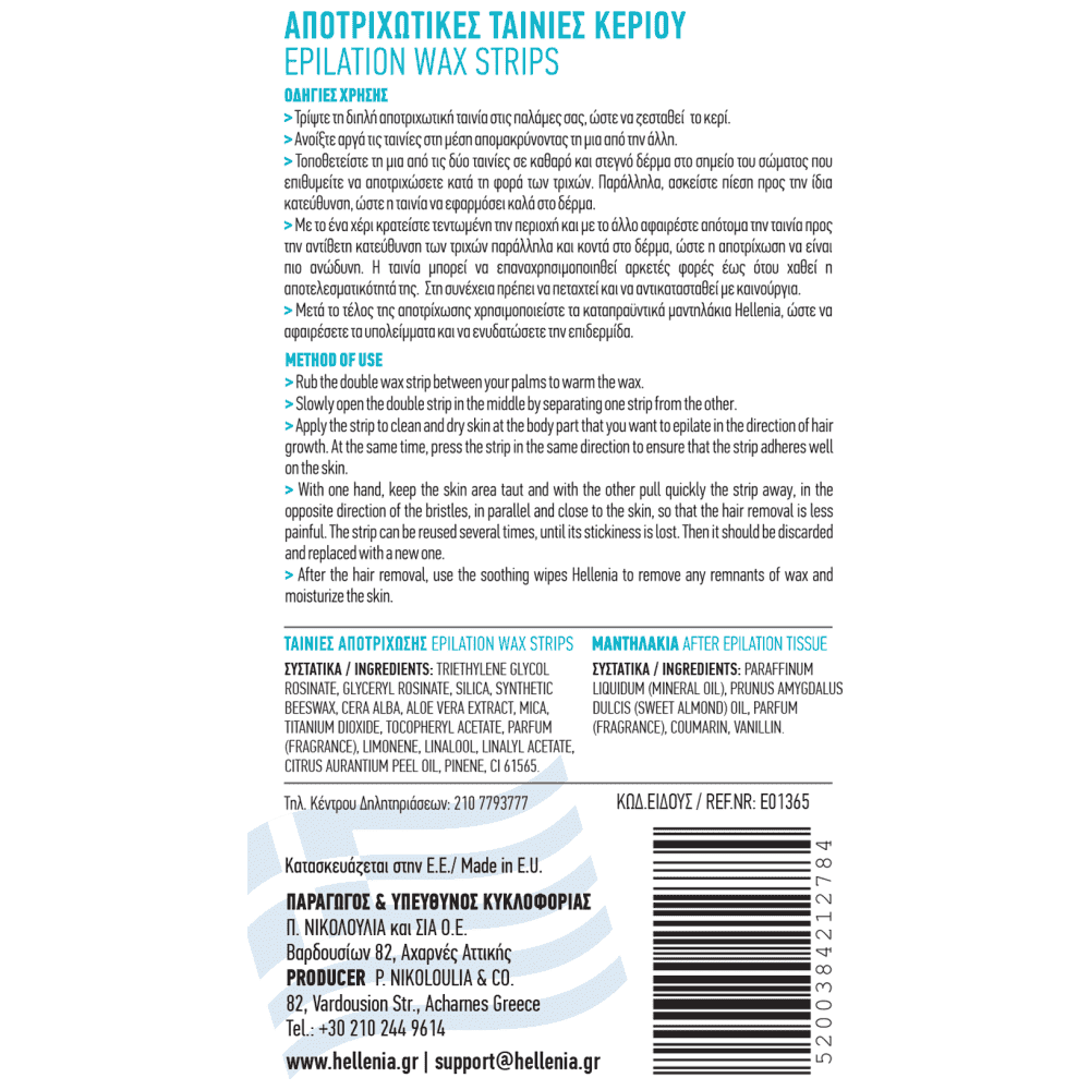 HELLENIA Αποτριχωτικές Ταινίες με Κερί για το Πρόσωπο με Μαντηλάκια εμποτισμένα με λάδι για μετά την αποτρίχωση. Για Κανονικό και Ευαίσθητο δέρμα.