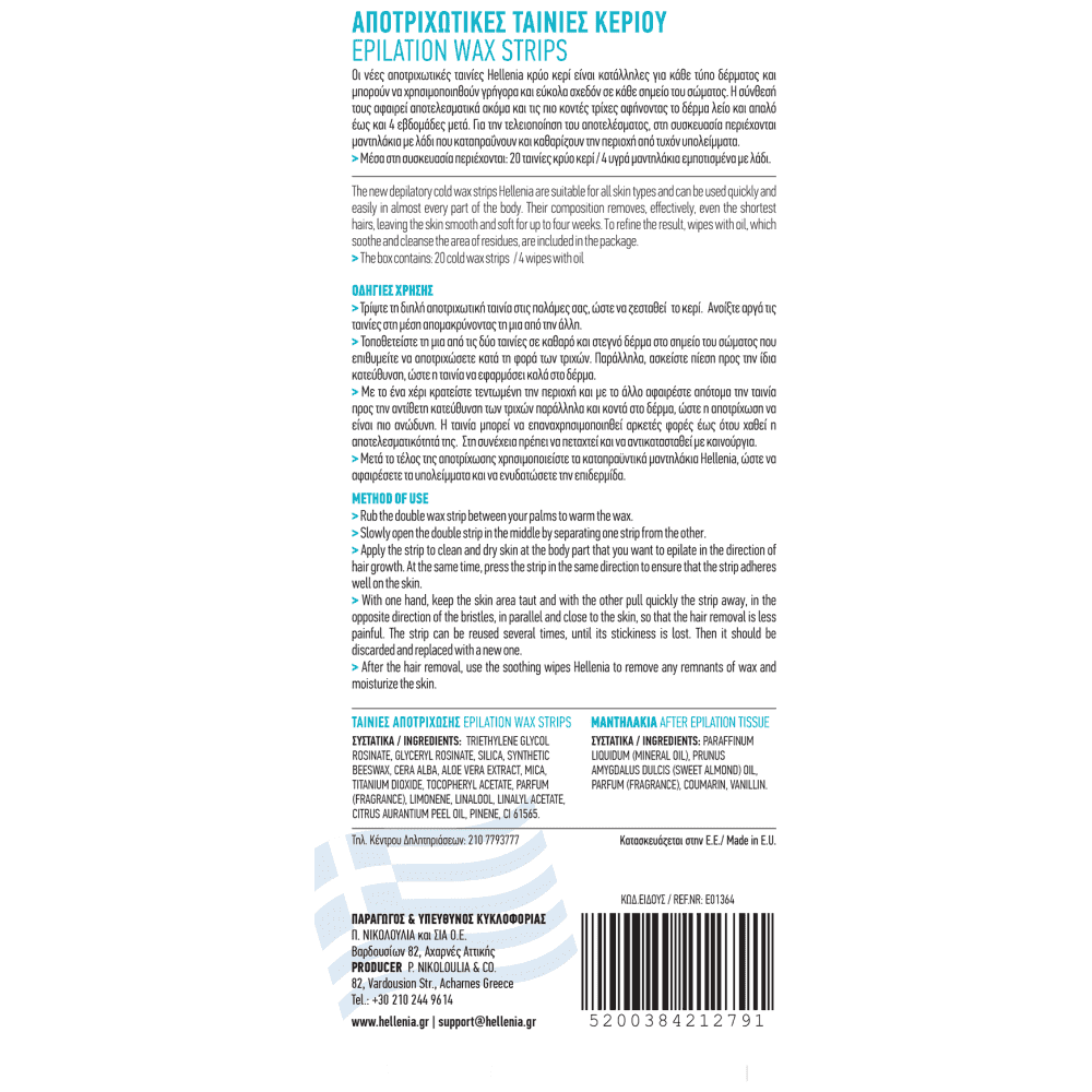 1. Τρίψτε τη διπλή αποτριχωτική ταινία στις παλάμες σας, ώστε να ζεσταθεί το κερί. Ανοίξτε αργά τις ταινίες στη μέση απομακρύνοντας τη μία από την άλλη. 2. Τοποθετήστε τη μία από τις δύο ταινίες σε καθαρό και στεγνό δέρμα στο σημείο του σώματος που επιθυμείτε να αποτριχώσετε κατά τη φορά των τριχών. Παράλληλα, ασκήστε πίεση προς την ίδια κατεύθυνση, ώστε η ταινία να εφαρμόσει καλά στο δέρμα. 3. Με το ένα χέρι κρατήστε τεντωμένη την περιοχή και με το άλλο αφαιρέστε απότομα την ταινία προς την αντίθετη κατεύθυνση των τριχών παράλληλα και κοντά στο δέρμα, ώστε η αποτρίχωση να είναι πιο ανώδυνη. Η ταινία μπορεί να χρησιμοποιηθεί ξανά, αρκετές φορές, έως ότου χαθεί η αποτελεσματικότητά της. Στη συνέχεια πρέπει να πεταχτεί και να αντικατασταθεί με καινούργια. 4. Μετά το τέλος της αποτρίχωσης χρησιμοποιήστε τα καταπραϋντικά μαντηλάκια Hellenia, ώστε να αφαιρέσετε τα υπολείμματα και να ενυδατώσετε την επιδερμίδα.