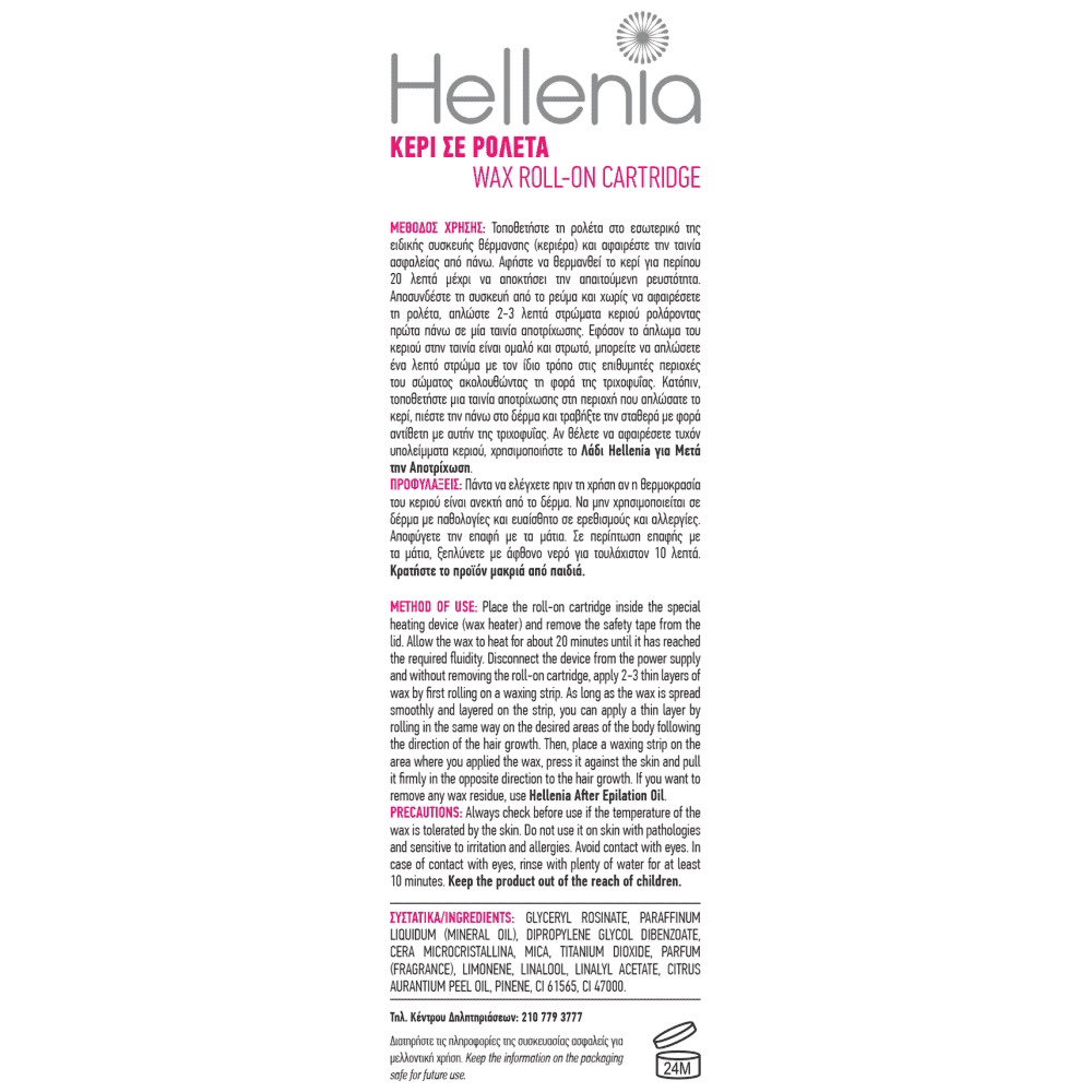Τοποθετήστε τη ρολέτα στο εσωτερικό της ειδικής συσκευής θέρμανσης (κεριέρα) και αφαιρέστε την ταινία ασφαλείας από πάνω. Αφήστε να θερμανθεί το κερί για περίπου 20 λεπτά μέχρι να αποκτήσει την απαιτούμενη ρευστότητα. Αποσυνδέστε τη συσκευή από το ρεύμα και χωρίς να αφαιρέσετε τη ρολέτα, απλώστε 2-3 λεπτά στρώματα κεριού ρολάροντας πρώτα πάνω σε μία ταινία αποτρίχωσης. Εφόσον το άπλωμα του κεριού στην ταινία είναι ομαλό και στρωτό, μπορείτε να απλώσετε ένα λεπτό στρώμα με τον ίδιο τρόπο στις επιθυμητές περιοχές του σώματος ακολουθώντας τη φορά της τριχοφυΐας. Κατόπιν, τοποθετήστε μια ταινία αποτρίχωσης στη περιοχή που απλώσατε το κερί, πιέστε την πάνω στο δέρμα και τραβήξτε την σταθερά με φορά αντίθετη με αυτήν της τριχοφυΐας. Αν θέλετε να αφαιρέσετε τυχόν υπολείμματα κεριού, χρησιμοποιήστε το Λάδι Hellenia για Μετά την Αποτρίχωση.