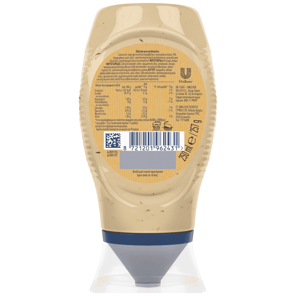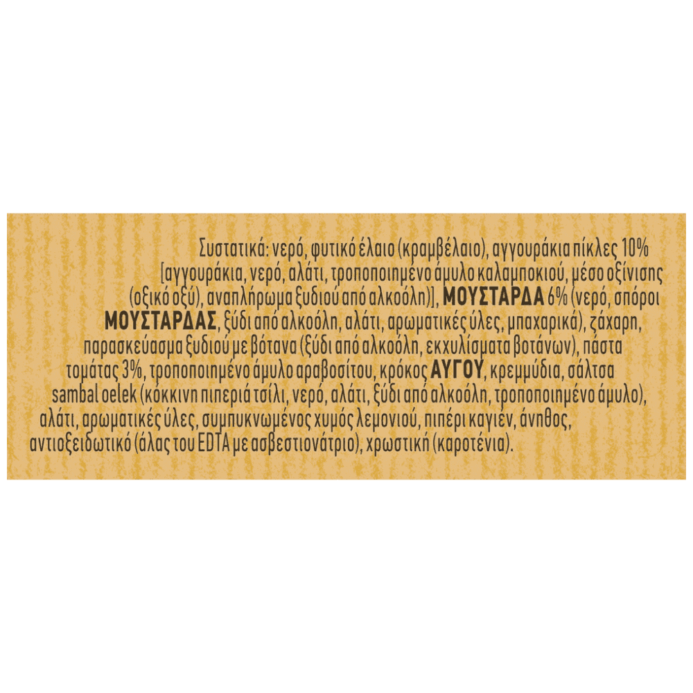 νερό, φυτικό έλαιο (κραμβέλαιο), αγγουράκια πίκλες 10% [αγγουράκια, νερό, αλάτι, τροποποιημένο άμυλο καλαμποκιού, μέσο οξίνισης (οξικό οξύ), αναπλήρωμα ξυδιού από αλκοόλη)], ΜΟΥΣΤΑΡΔΑ 6% (νερό, σπόροι ΜΟΥΣΤΑΡΔΑΣ, ξύδι από αλκοόλη, αλάτι, αρωματικές ύλες, μπαχαρικά), ζάχαρη, παρασκεύασμα ξυδιού με βότανα (ξύδι από αλκοόλη, εκχυλίσματα βοτάνων), πάστα τομάτας 3%, τροποποιημένο άμυλο αραβοσίτου, κρόκος ΑΥΓΟΥ, κρεμμύδια, σάλτσα sambal oelek (κόκκινη πιπεριά τσίλι, νερό, αλάτι, ξύδι από αλκοόλη, τροποποιημένο άμυλο), αλάτι, αρωματικές ύλες, συμπυκνωμένος χυμός λεμονιού, πιπέρι καγιέν, άνηθος, αντιοξειδωτικό (άλας του EDTA με ασβεστιονάτριο), χρωστική (καροτένια). Αλλεργιογόνα