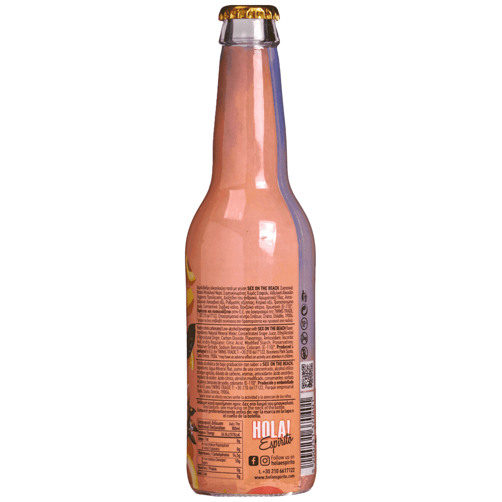Εμπνευσμένα από ανθρώπους με πάθος, τα HOLA! ESPIRITO Cocktails No Added Sugar συνδυάζουν άριστα υλικά με πλούσιες γεύσεις καλοκαιρινών φρούτων. Κάθε συστατικό είναι πολύ προσεχτικά επιλεγμένο και δίνει μοναδική αίσθηση δροσιάς και ανανέωσης. Με 4,5% αλκοόλ. Έτοιμο αεριούχο ποτό με αλκοόλη με γεύση Sex on the Beach.