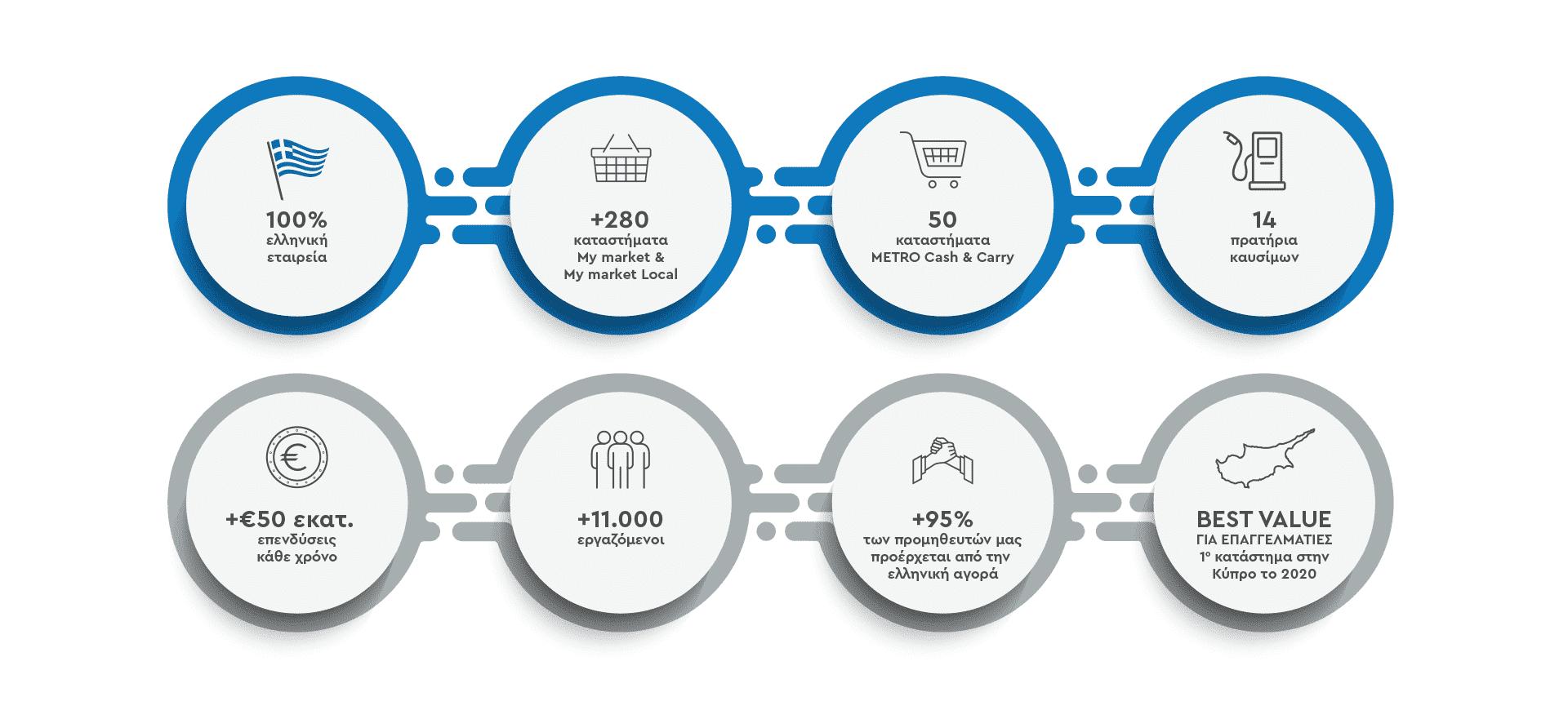 Από την πρώτη μέρα της ίδρυσής της το 1976, η METRO AEBE είναι μια 100% ελληνική εταιρεία με οικογενειακή μετοχική σύνθεση. Διαθέτει δύο αλυσίδες καταστημάτων: τα καταστήματα χονδρικής METRO Cash & Carry, με 50 σημεία σε όλη την χώρα και τα καταστήματα λιανικής My market και My market Local (Franchise), με περισσότερα από 280 σημεία λιανικής πώλησης. Τον Ιανουάριο του 2020, η εταιρεία άνοιξε το πρώτο της κατάστημα (BEST VALUE για ΕΠΑΓΓΕΛΜΑΤΙΕΣ) στην Κύπρο. Η εταιρεία απασχολεί περισσότερους από 11.000 εργαζόμενους, γεγονός που την καθιστά έναν από τους μεγαλύτερους εργοδότες πανελλαδικά.