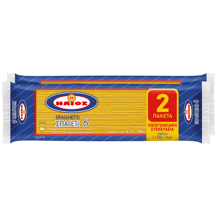ΝΕΑ ΟΙΚΟΓΕΝΕΙΑΚΗ ΣΥΣΚΕΥΑΣΙΑ 2 ΤΜΧ.ΗΛΙΟΣ ΣΠΑΓΕΤΙ Νο 6 500γ. Με πάνω από 90 χρόνια ελληνικής παράδοσης, τα ζυμαρικά ΗΛΙΟΣ αποτελούν σημείο αναφοράς για ποιότητα, σταθερότητα και γεύση. Παράγονται από εκλεκτό σιμιγδάλι σκληρού σίτου, με αυστηρά ελεγχόμενη διαδικασία παραγωγής, βράζουν ομοιόμορφα, κρατούν το σχήμα και τη γεύση τους και αγκαλιάζουν κάθε σάλτσα από μια απλή ντομάτα μέχρι την πιο δημιουργική συνταγή.