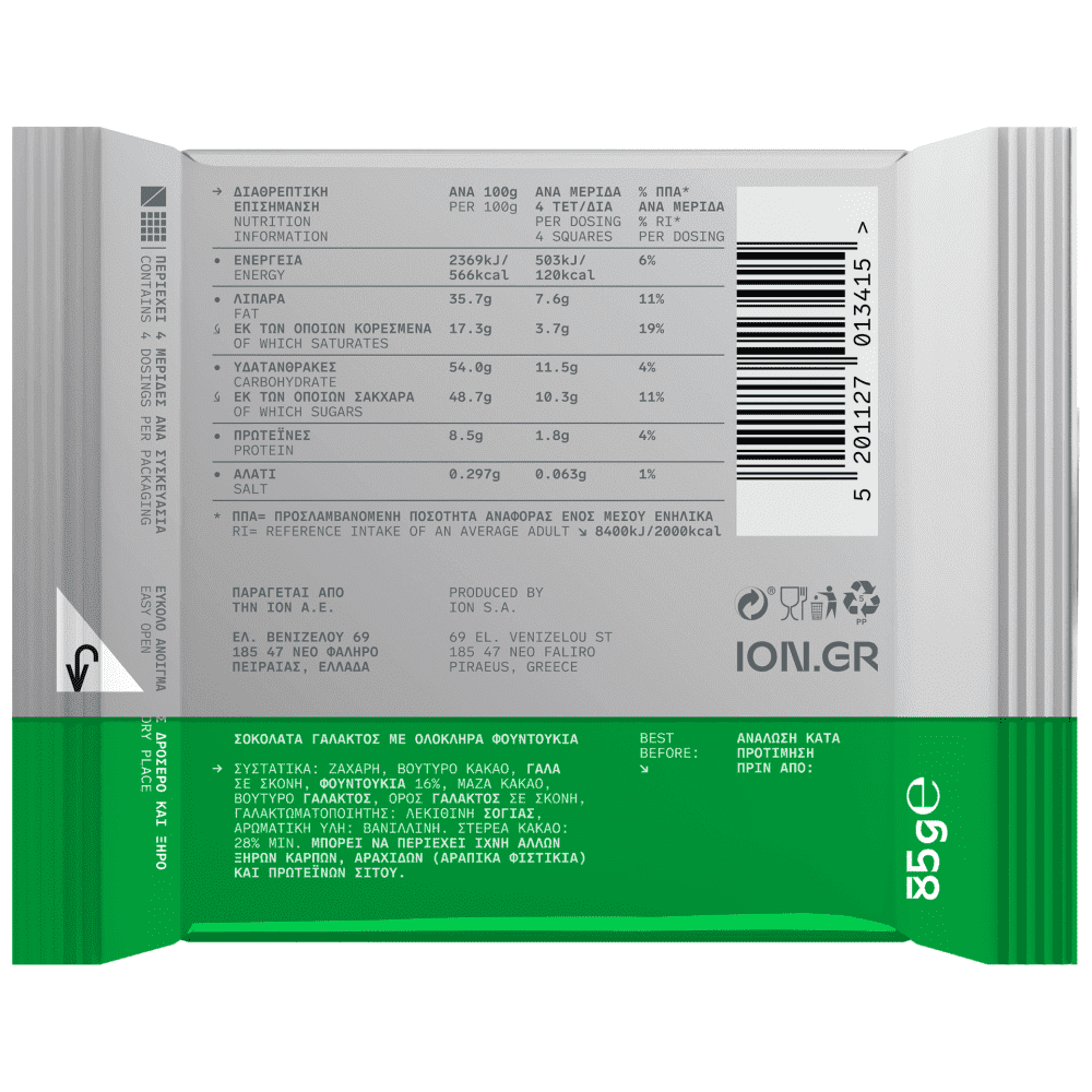 | ΑΝΑ 100g ΠΡΟΪΟΝΤΟΣ/ PER 100g OF PRODUCT | ΑΝΑ ΜΕΡΙΔΑ (4 ΤΕΤΡΑΓΩΝΙΔΙΑ) | % ΠΠΑ*/RI* ΑΝΑ ΜΕΡΙΔΑ/ PER DOSING | |