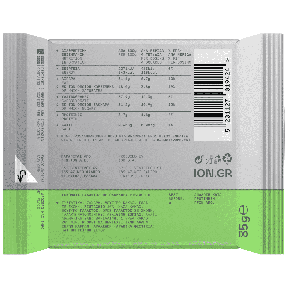 | ΑΝΑ 100g ΠΡΟΪΟΝΤΟΣ/ PER 100g OF PRODUCT | ΑΝΑ ΜΕΡΙΔΑ (4 ΤΕΤΡΑΓΩΝΙΔΙΑ) | % ΠΠΑ*/RI* ΑΝΑ ΜΕΡΙΔΑ/ PER DOSING | |