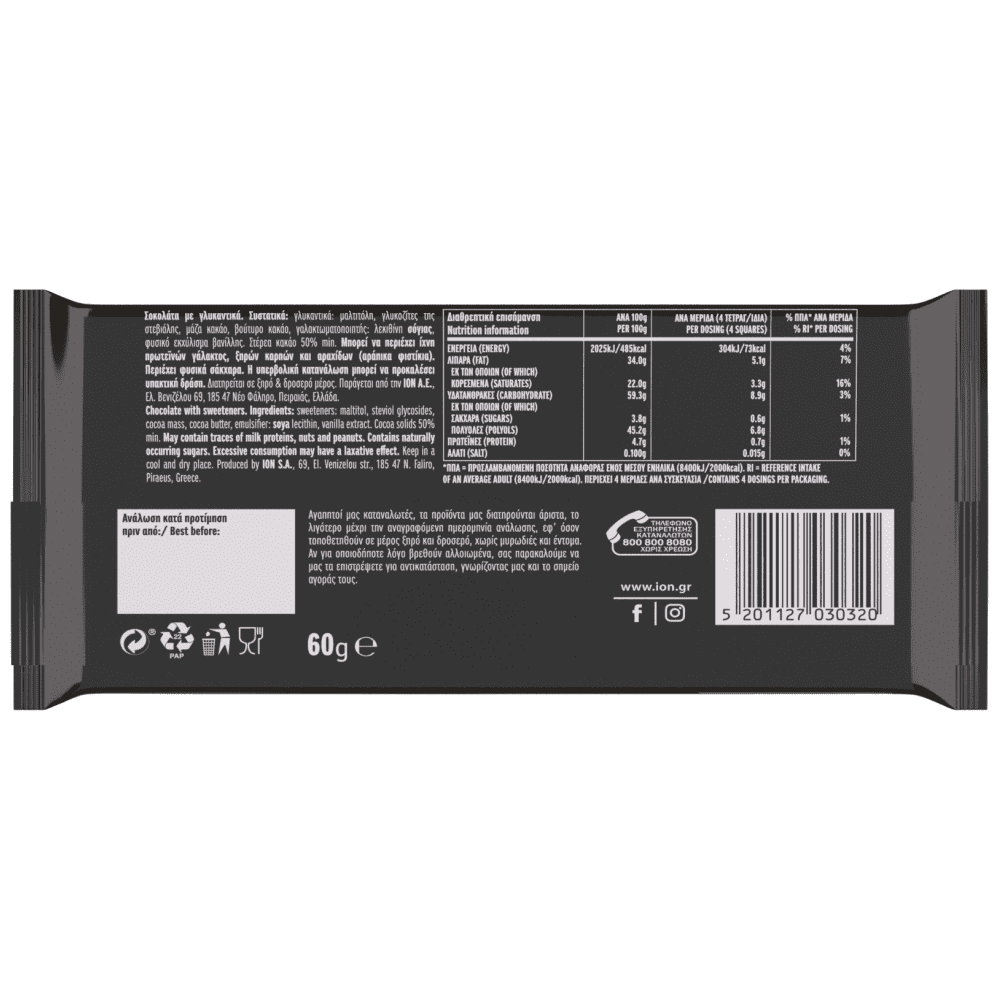 | ΑΝΑ 100g ΠΡΟΪΟΝΤΟΣ/ PER 100g OF PRODUCT | ΑΝΑ ΜΕΡΙΔΑ (4 ΤΕΤΡΑΓΩΝΙΔΙΑ) | % ΠΠΑ*/RI* ΑΝΑ ΜΕΡΙΔΑ/ PER DOSING | |