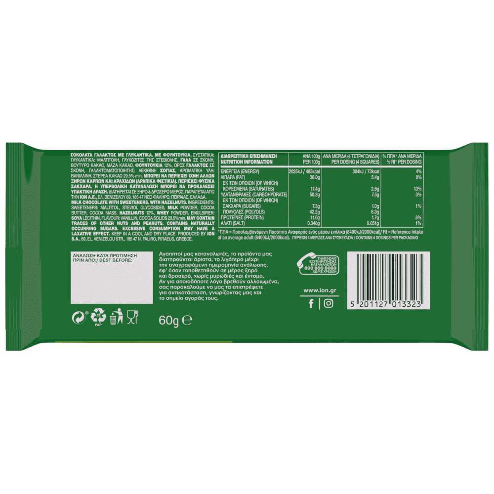 | ΑΝΑ 100g ΠΡΟΪΟΝΤΟΣ/ PER 100g OF PRODUCT | ΑΝΑ ΜΕΡΙΔΑ (4 ΤΕΤΡΑΓΩΝΙΔΙΑ) | % ΠΠΑ*/RI* ΑΝΑ ΜΕΡΙΔΑ/ PER DOSING | |
